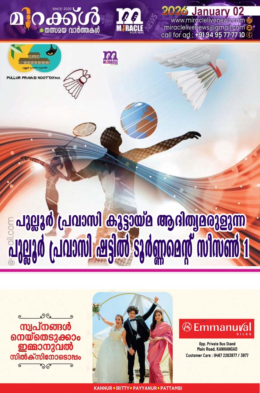 കാഞ്ഞങ്ങാട്:കാസര്കോട് ജില്ലയിലെ പുല്ലൂരും പരിസര പ്രദേശങ്ങളിലെ (പുല്ലൂര് വില്ലജ് ) ഒരുകൂട്ടം പ്രവാസികള് രൂപം കൊടുത്ത സംഘടനയാണ് ‘പുല്ലര് പ്രവാസി കൂട്ടായ്മ’ ചുരുങ്ങിയ കാലയളവിനുള്ളില് തന്നെ സാമൂഹിക സാംസ്കാരിക രംഗത്ത് നിരവധി സഹായങ്ങള് ചെയ്യാന് കൂട്ടായ്മക്ക് സാധിച്ചിട്ടുണ്ട്. പുല്ലൂര് പ്രവാസി കൂട്ടായ്മ ആദിത്യമരുളുന്ന ഷട്ടില് ടൂര്ണ്ണമെന്റ് ജനുവരി 10 ന് വൈകീട്ട് 6 മണിമുതല് അജ്മാന് അല് മദീന അക്കാദമി ഇന്ഡോര് സ്റ്റേഡിയത്തില്വെച്ചു നടക്കും. ഷട്ടില് ടൂര്ണ്ണമെന്റ് കമ്മിറ്റി അനില് പുല്ലൂരിന്റെ നേതൃത്വത്തില് രതീഷ് കുറുമ്പാലം , രാജേഷ് കുറുമ്പാലം, പുഷ്പാകരന് ചാലിങ്കാല്, പ്രദീപ് പുല്ലൂര് , സത്യന് അമ്പലത്തറ, അശോകന് കൊടവലം എന്നിവരെ ഉള്പ്പെടുത്തി ടൂര്ണ്ണമെന്റ് കമ്മിറ്റി രൂപീകരിച്ചു. ഇ& ഇ+ കാറ്റഗറിയില് ആയിരിക്കും മത്സങ്ങള്, യു എ ഇ യിലെ പ്രമുഖ ടീമുകള് മത്സരത്തില് പങ്കെടുക്കുന്നത്. ടീമുകളുടെ റെജിസ്ട്രേഷന് വേണ്ടി താഴെ കൊടുത്ത നമ്പറില് ബന്ധപ്പെടുക.