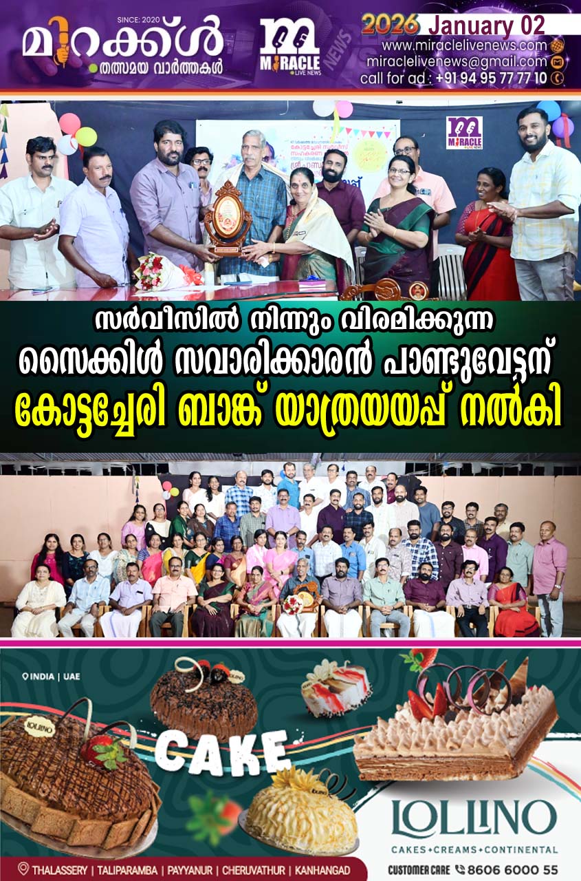 കാഞ്ഞങ്ങാട്:തൊഴിലെടുത്ത് അപൂര്വമായി ലഭിക്കുന്ന നീണ്ട 47 വര്ഷത്തെ സേവനത്തിനുശേഷം കോട്ടച്ചേരി സര്വീസ് സഹകരണ ബാങ്ക് കലക്ഷന് ഏജന്റായി സര്വീസില് നിന്നും വിരമിക്കുന്ന കാഞ്ഞങ്ങാടിന്റെ ചലനത്തെ തന്റെ സൈക്കിള് യാത്രയിലൂടെ കണ്ട എല്ലാവരും സ്നേഹത്തോടെ പാണ്ടുവേട്ടന് എന്ന് വിളിക്കുന്ന പാണ്ടുറംഗ ഷേണായിക്ക് ബാങ്ക് ഭരണസമിതിയും, ജീവനക്കാരും, കേരള കോ-ഓപ്പറേറ്റീവ് എംപ്ലോയിസ് യൂണിയന് അംഗങ്ങളും ചേര്ന്ന് യാത്രയയപ്പ് നല്കി. തന്റെ സൈക്കിള് യാത്രയിലൂടെ തൊഴിലും ജനകീയ പ്രവര്ത്തനവും ഒരുമിച്ച് ചേര്ത്ത് എല്ലാവര്ക്കും തന്റെ കഴിവും പരിചയസമ്പത്തും പ്രയോജനപ്പെടുത്തി നിരവധി സഹായങ്ങള് നല്കി ജീവിതത്തില് എന്നും സത്യസന്ധത പുലര്ത്തിയ ബാങ്കിന്റെവളര്ച്ചയ്ക്കൊപ്പം ചേര്ന്നുനിന്ന വ്യക്തിത്വത്തിന് ഉടമയാണ് നീണ്ട വര്ഷത്തെ സേവനത്തിന് ശേഷം സര്വീസില് നിന്നും വിരമിക്കുന്ന പാണ്ടുയേട്ടന്. കുന്നുമ്മല് മുഖ്യ ശാഖ ഹാളില് നടന്ന യാത്രയയപ്പ് ചടങ്ങ് വൈസ് പ്രസിഡണ്ട് വി ഗിനീഷ് ഉദ്ഘാടനം ചെയ്ത് ഭരണസമിതിയുടെ ഉപഹാരം നല്കി. ജീവനക്കാരുടെ സ്നേഹോപഹാരം ബാങ്ക് സെക്രട്ടറി വി വി ലേഖയും, യൂണിയന്റെ ഉപകാരം കേരള കോപ്പറേറ്റീവ് എംപ്ലോയീസ് യൂണിയന് ജില്ലാ സെക്രട്ടറി കെ വി വിശ്വനാഥനും കൈമാറി. വിഷനില് കുമാര്.അദ്ധ്യക്ഷനായി. എന് ഗോപി, പ്രിയേഷ് കാഞ്ഞങ്ങാട്, കെ. തങ്കമണി, സി. വിജയന്, എ വി സഞ്ചയന്, എ കെ ലക്ഷ്മണന്, ടി.പി.രാജേഷ്, എം എ ഷ നൂജ്എന്നിവര് സംസാരിച്ചു. സ്റ്റാഫ് സെക്രട്ടറി കെ പ്രഭാകരന്. സ്വാഗതവും മെയിന് ബ്രാഞ്ച് മാനേജര് എം.സതീശന് നന്ദിയും പറഞ്ഞു.