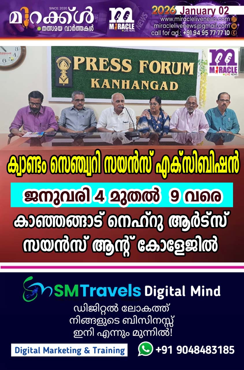 ക്വാണ്ടം സെഞ്ച്വറി സയന്‍സ് എക്സിബിഷന്‍ ജനുവരി 4 മുതല്‍ 9 വരെ കാഞ്ഞങ്ങാട് നെഹ്‌റു ആര്‍ട്സ് സയന്‍സ് ആന്റ് കോളേജില്‍