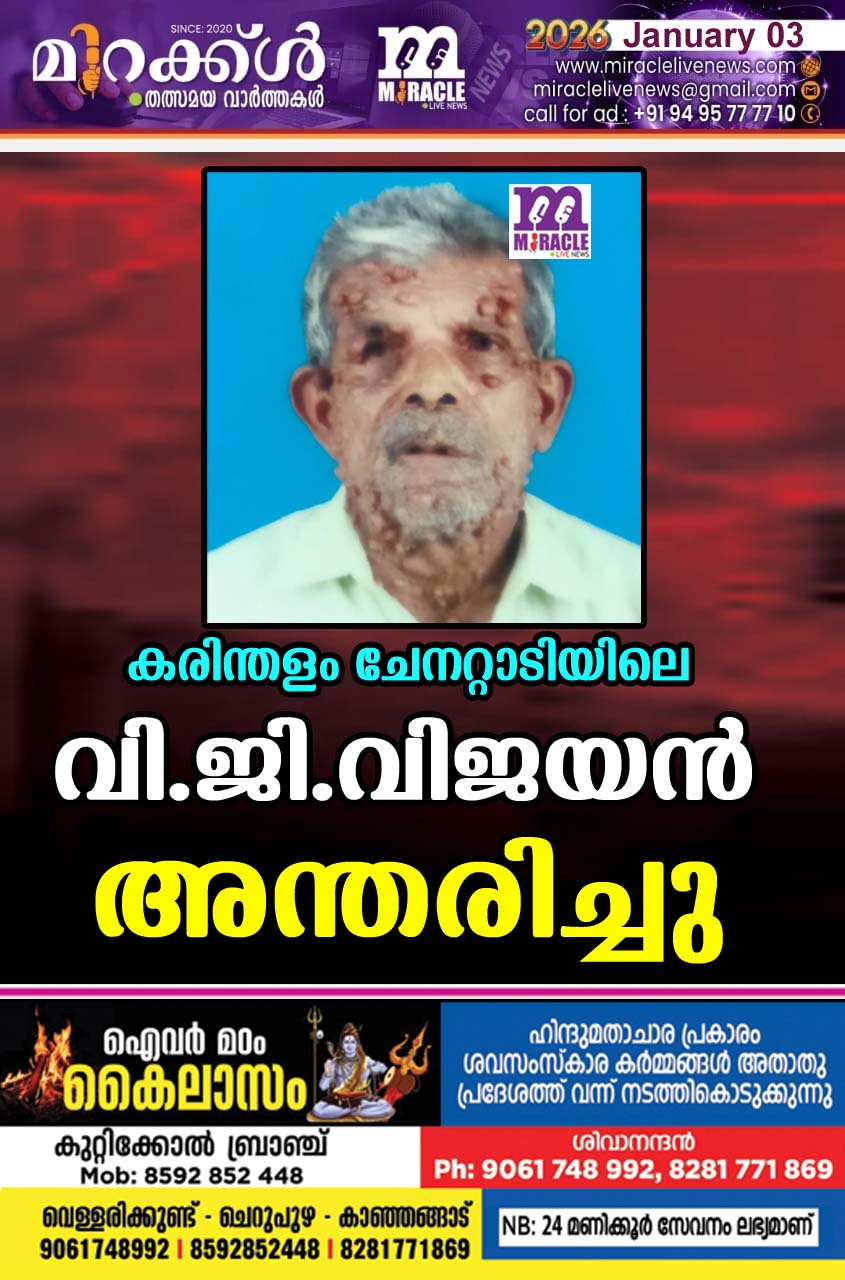 കരിന്തളം: ചേനറ്റാടിയിലെ വി.ജി. വിജയന് (70) അന്തരിച്ചു. ഭാര്യ: പാറുകുട്ടി. മക്കള്: പ്രീത, പ്രിയജ.മരുമക്കള് :രാജേഷ് പ്രാപൊയില്, ഷിജു കടുമേനി.