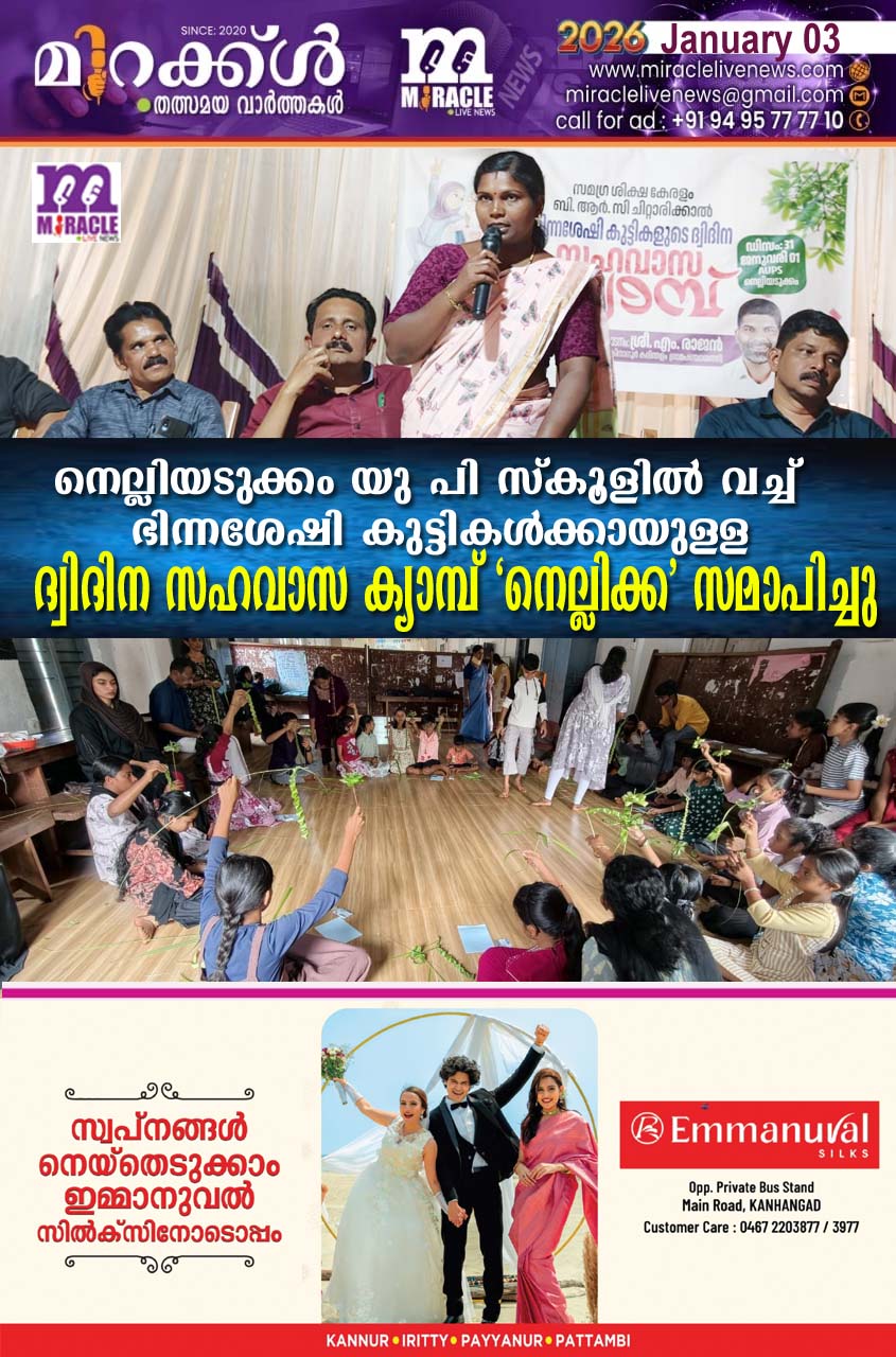 കരിന്തളം:സമഗ്ര ശിക്ഷാ കേരളം കാസര്‍കോട് ചിറ്റാരിക്കാല്‍ ബി ആര്‍ സി യുടെ നേതൃത്വത്തില്‍ നെല്ലിയടുക്കം യു പി സ്‌കൂളില്‍ വച്ച് സംഘടിപ്പിച്ച ഭിന്നശേഷി കുട്ടികള്‍ക്കായുള്ള ദ്വിദിന സഹവാസ ക്യാമ്പ് ‘നെല്ലിക്ക’ സമാപിച്ചു.കിനാനൂര്‍ കരിന്തളം ഗ്രാമപഞ്ചായത്ത് പ്രസിഡണ്ട് എം രാജന്‍ ക്യാമ്പ് ഉദ്ഘാടനം ചെയ്തു.