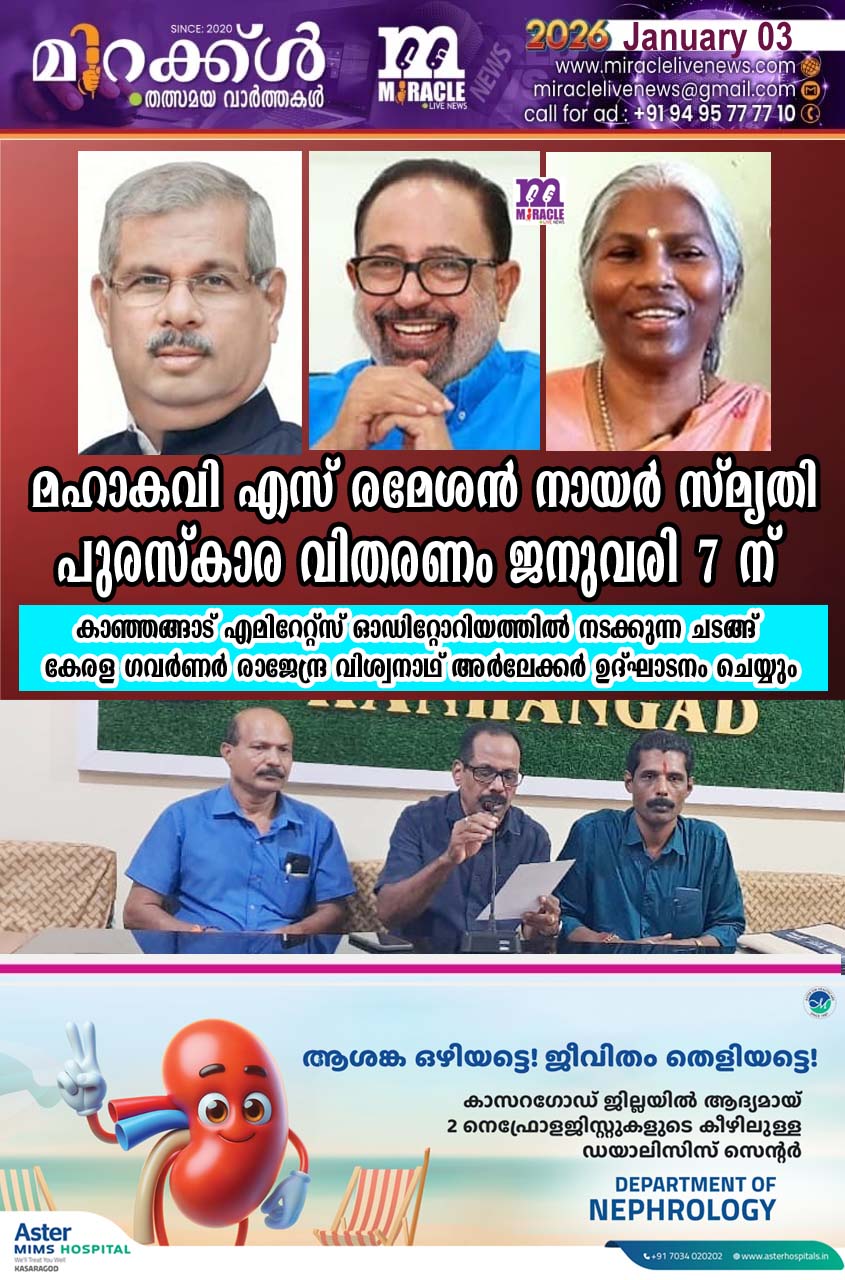 മഹാകവി എസ് രമേശന്‍ നായര്‍ സ്മൃതി പുരസ്‌കാര വിതരണം ജനുവരി 7 ന്; കാഞ്ഞങ്ങാട് എമിറേറ്റ്‌സ് ഓഡിറ്റോറിയത്തില്‍ നടക്കുന്ന ചടങ്ങ് കേരള ഗവര്‍ണര്‍ രാജേന്ദ്ര വിശ്വനാഥ് അര്‍ലേക്കര്‍ ഉദ്ഘാടനം ചെയ്യും
