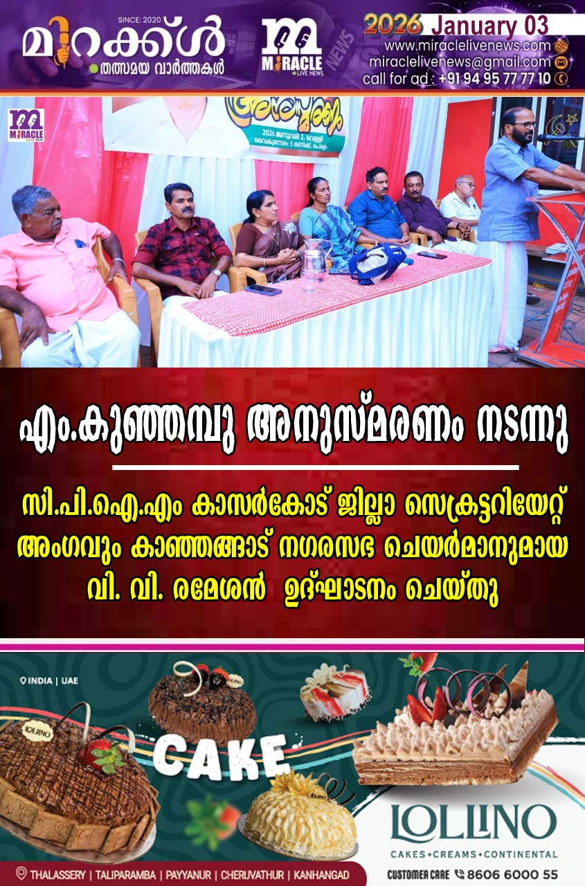 പുല്ലൂര് : പുല്ലൂര് പെരിയ പഞ്ചായത്തില് കമ്മ്യൂണിസ്റ്റ് പ്രസ്ഥാനവും തൊഴിലാളി വര്ഗ്ഗ പ്രസ്ഥാനവും കെട്ടിപ്പിടിക്കുന്നതില് നേതൃത്വപരമായ പങ്കുവഹിച്ച എം. കുഞ്ഞമ്പുവിന്റെ മൂന്നാം ചരമ വാര്ഷികവുംഅനുസ്മരണവും സി.പി.ഐ.എം പുല്ലൂര് ലോക്കല് കമ്മിറ്റിയുടെ നേതൃത്വത്തില് പെരളത്ത് നടന്നു. സി.പി.ഐ.എം കാസര്കോട് ജില്ലാ സെക്രട്ടറിയേറ്റ് അംഗവും കാഞ്ഞങ്ങാട് നഗരസഭ ചെയര്മാനുമായ വി. വി. രമേശന് ഉദ്ഘാടനം ചെയ്ത് അനുസ്മരണ പ്രഭാഷണം നടത്തി. ലോക്കല് സെക്രട്ടറി ടി. ബിന്ദു അധ്യക്ഷത വഹിച്ചു. സുനു ഗംഗാധരന്, എ. കൃഷ്ണന്, മാടിക്കാല് നാരായണന്,എം. വി. നാരായണന്, വി. നാരായണന് മാസ്റ്റര് എന്നിവര് സംസാരിച്ചു. പി. കുഞ്ഞിക്കേളു സ്വാഗതം പറഞ്ഞു.