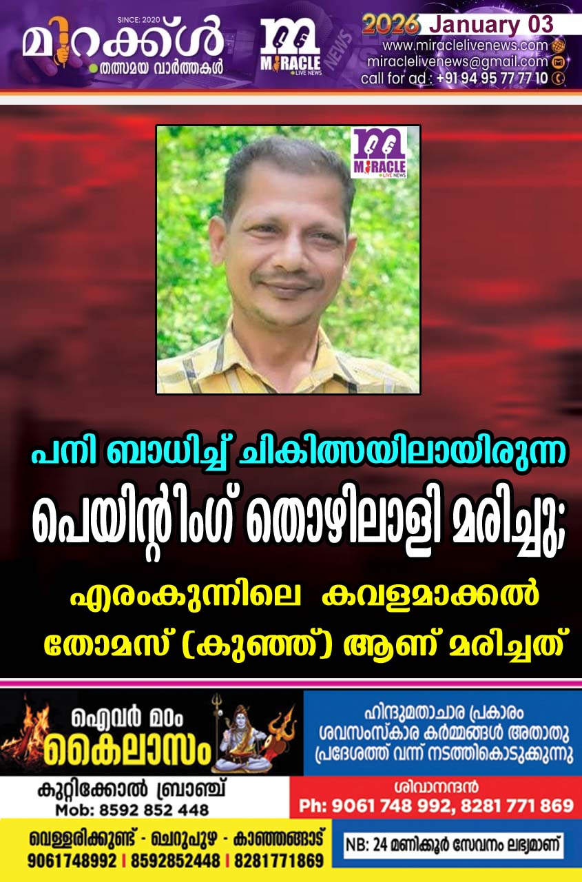 പനി ബാധിച്ച് ചികിത്സയിലായിരുന്ന പെയിന്റിംഗ് തൊഴിലാളി മരിച്ചു; എരംകുന്നിലെ കവളമാക്കല് തോമസ് (കുഞ്ഞ്) ആണ് മരിച്ചത്