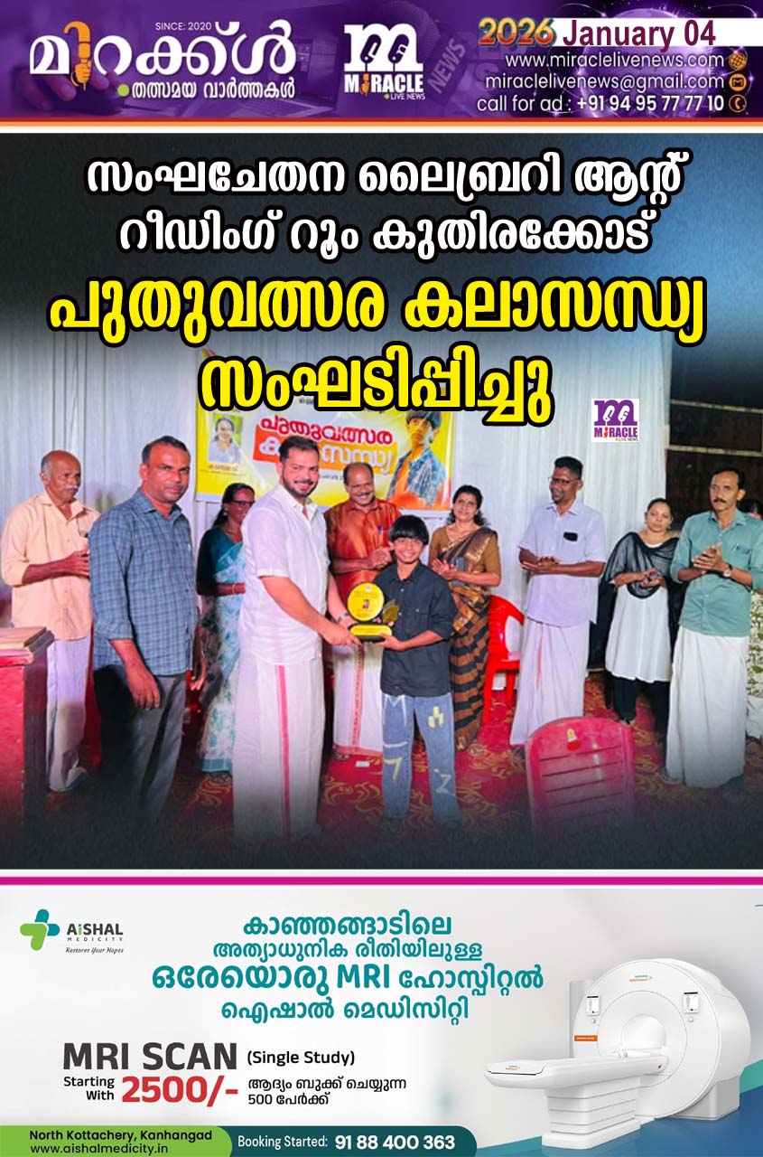 ഉദുമ:സംഘചേതന ലൈബ്രറി ആന്റ് റീഡിംഗ് റൂം കുതിരക്കോട് പുതുവത്സര കലാസന്ധ്യ സംഘടിപ്പിച്ചു. കലാ സന്ധ്യയുടെ ഉദ്ഘാടനം