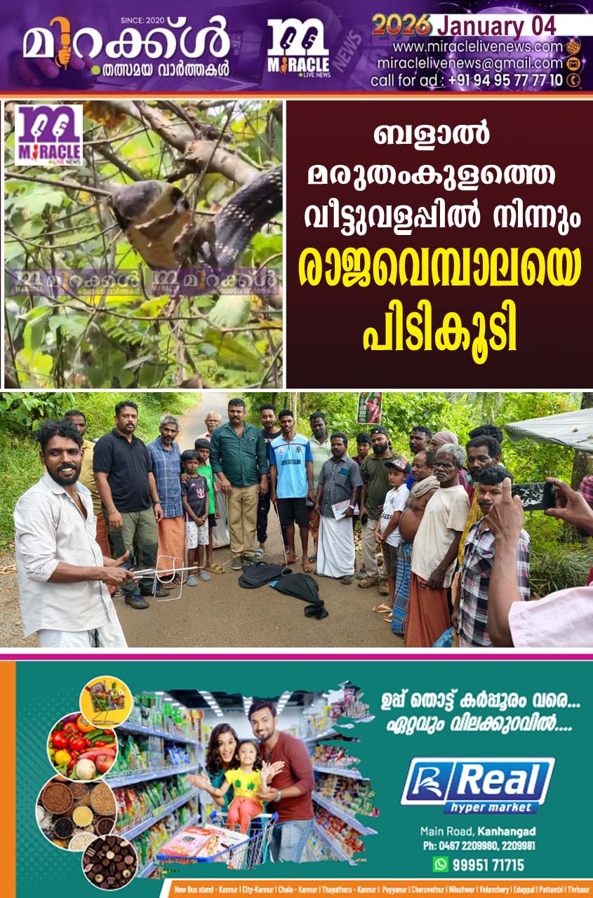 കാഞ്ഞങ്ങാട് : മരത്തിന് മുകളില് കയറിയ രാജവെമ്പാലയെ പിടികൂടി. ബളാല് മരുതം തുളത്തെ കോരന്റെ വീടിന് സമീപം മരത്തില്