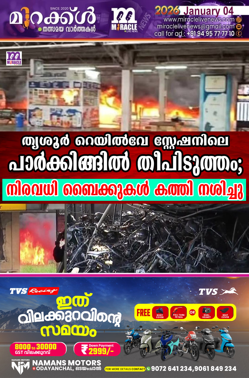 തൃശൂര്‍ റെയില്‍വേ സ്റ്റേഷനിലെ പാര്‍ക്കിങ്ങില്‍ തീപിടുത്തം; നിരവധി ബൈക്കുകള്‍ കത്തി നശിച്ചു