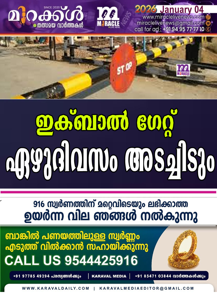 കാഞ്ഞങ്ങാട് :പാളത്തിലെ സ്ലീപ്പര് മാറ്റുന്ന പ്രവൃത്തി നടക്കുന്നതിനാല് അജാനൂര് ഇക്ബാല് റെയില്വേ ഗേറ്റ് എട്ടിന് രാവിലെ എട്ടു മുതല് 14 ന് വൈകീട്ട് അഞ്ചുവരെ ഒരാഴ്ചക്കാലം അടച്ചിടുമെന്ന് ദക്ഷിണ റെയില്വേ അറിയിച്ചു.