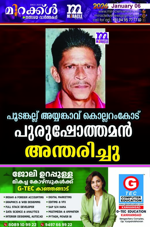 രാജപുരം:പൂടങ്കല്ല് അയ്യങ്കാവ് കൊല്ലറംകോട് പുരുഷോത്തമന് മരണപ്പെട്ടു. മാതാവ് പരേതയായ മടത്തിപ്പറമ്പില് ഭാരതി അമ്മ. ഭാര്യ : അനിത, മക്കള്: ഷിനോ (സ്വകാര്യ ബസ് ഡ്രൈവര്), മനോജ് (മസ്ക്കറ്റ്), അംബിക (പയ്യന്നൂര് ).