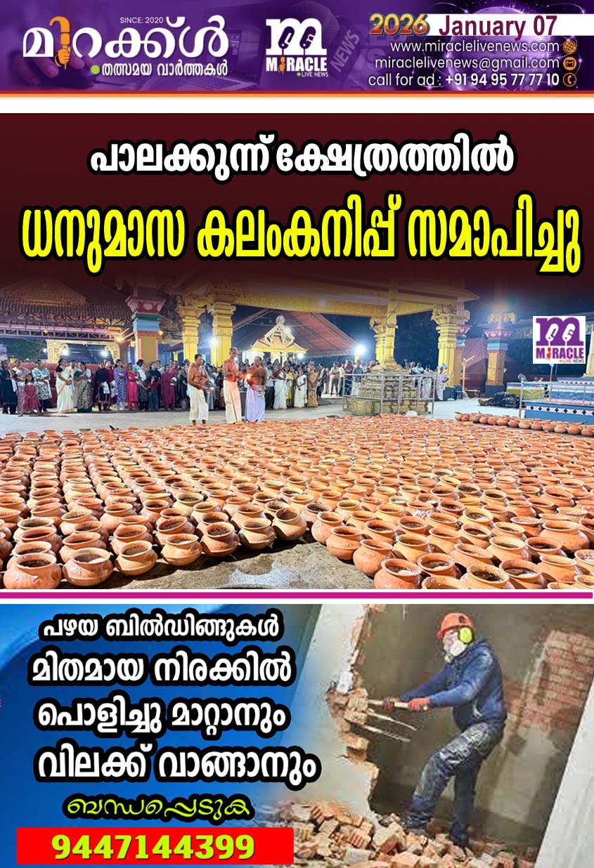 പാലക്കുന്ന് : കഴകം ഭഗവതി ക്ഷേത്രത്തില് ധനുമാസ ചെറിയ കലംകനിപ്പ് സമാപിച്ചു.ചൊവ്വാഴ്ച രാവിലെ ഭണ്ഡാര വീട്ടില് നിന്ന് ആദ്യ സമര്പ്പണമായി പണ്ടാരക്കലം ക്ഷേത്രത്തിലെത്തി . തുടര്ന്ന് വിവിധ പ്രദേശിക പരിധികളില് നിന്ന് കാല്നട യായി വ്രതശുദ്ധിയോടെ സ്ത്രീകള് വിഭവങ്ങള് നിറച്ച പുത്തന് മണ്കലങ്ങളുമായി ക്ഷേത്രത്തിലെത്തി. പ്രദക്ഷിണം പൂര്ത്തിയാക്കിയ ശേഷം സമര്പ്പണം നടത്തി. ക്ഷേത്രത്തില് എത്തിയവര്ക്ക് മാങ്ങ അച്ചാര് ചേര്ത്ത കഞ്ഞി ഒരുക്കിയിരുന്നു. വാല്യക്കാരുടെ സഹായത്തോടെ