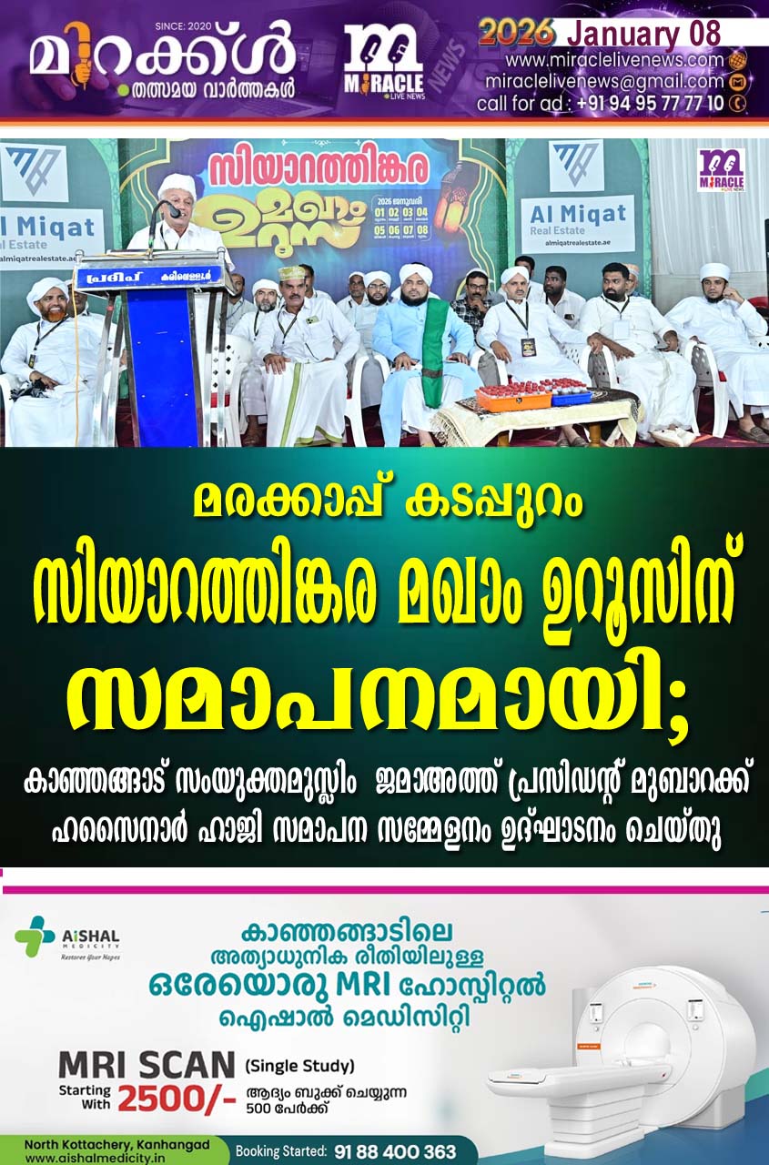 നീലേശ്വരം -മരക്കാപ്പ് കടപ്പുറം സിയാറത്തിങ്കര മഖാം ഉറൂസിന് സമാപനമായി. കാഞ്ഞങ്ങാട് സംയുക്തമുസ്ലിം ജമാഅത്ത് പ്രസിഡന്റ് മുബാറക്ക് ഹസൈനാര്‍ ഹാജി സമാപന സമ്മേളനം ഉദ്ഘാടനം ചെയ്തു. സിയാറത്തിങ്കര ജമാഅത്ത് പ്രസിഡന്റ് അശ്‌റഫ് അശ്‌റഫി ആറങ്ങാടി അദ്ധ്യക്ഷത വഹിച്ചു. ട്രഷറര്‍ വി. ശാഫി , സെക്രട്ടറി നിസാം പി.കെ, ഷാദുലി പി, അബ്ദുള്‍ ജബ്ബാര്‍ നിസാമി തിരുവട്ടൂര്‍ , സാധു സംരക്ഷണ കമ്മിറ്റി ട്രഷറര്‍ വി.മുഹമ്മദ് കുഞ്ഞി, വളണ്ടിയേഴ്‌സ് ക്യാപ്റ്റന്‍ അശ്‌റഫ്കണിച്ചിറ എന്നിവര്‍ പ്രസംഗിച്ചു. തുടര്‍ന്ന് സയ്യിദ് സൈനുദ്ധീന്‍ ബുഖാരി കുരിക്കുഴി തങ്ങള്‍ മുഖ്യപ്രഭാഷണവും , കൂട്ടു പ്രാര്‍ത്ഥനയ്ക്കും നേതൃത്വം നല്‍കി. ജമാഅത്ത് കമ്മിറ്റി ജനറല്‍ സെക്രട്ടറി അശ്‌റഫ് ചീന മ്മാടം സ്വാഗതവും, ഉറുസ് കമ്മിറ്റി ജോ: കണ്‍വീനര്‍ എ. മുസ്തഫ നന്ദിയും പറഞ്ഞു. തുടര്‍ന്ന് മെഗാ ദഫ് പ്രദര്‍ശനവും നടന്നു.