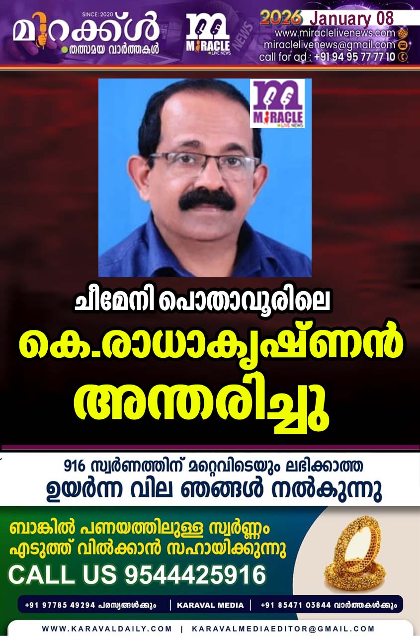 ചീമേനി:പൊതാവൂരിലെ കെ.രാധാകൃഷ്ണന് (62) അന്തരിച്ചു. അസുഖ ബാധിതനായി ചികിത്സയിലായിരുന്നു. സി പി ഐ (എം) കയ്യൂര് ഈസ്റ്റ് ലോക്കല് ക്കമ്മറ്റിയംഗമാണ്. പാലിയേറ്റീവ് മേഖലയിലെ സജീവ സാന്നിധ്യമായിരുന്നു . ചീമേനീ സര്വ്വീസ് സഹകരണ ബേങ്ക് മുന് സെക്രട്ടറിയായിരുന്നു. പട്ടേനയിലെ അപ്പൂ ഞ്ഞി നായര് സുഭദ്രാമ്മ ദമ്പതികളുടെ മകനാണ്. ഭാര്യ: വി.കെ. ശോഭന. (ചീമേനി ഗ്രാമ പഞ്ചായത്ത് മുന് മെമ്പര്,എന്.ആര്. ഇ.ജി. വര്ക്കേര്സ് യൂണിയന് ജില്ലാക്കമ്മറ്റിയംഗം, സി പി ഐ (എം) പൊതാവൂര് ബ്രാ ഞ്ചംഗം). മക്കള്: വി.കെ ശരണ്യ. വി.കെ.ശരണ് ദീപ് (ദുബൈ).മരുമകന്: വിനീത് (ദുബൈ) സഹോദരങ്ങള് : കെ. സുമിത്ര (വെസ്റ്റ് എളേരി ഗ്രാമ പഞ്ചായത്തംഗം) സുചിത്ര, ഹരിദാസ്.