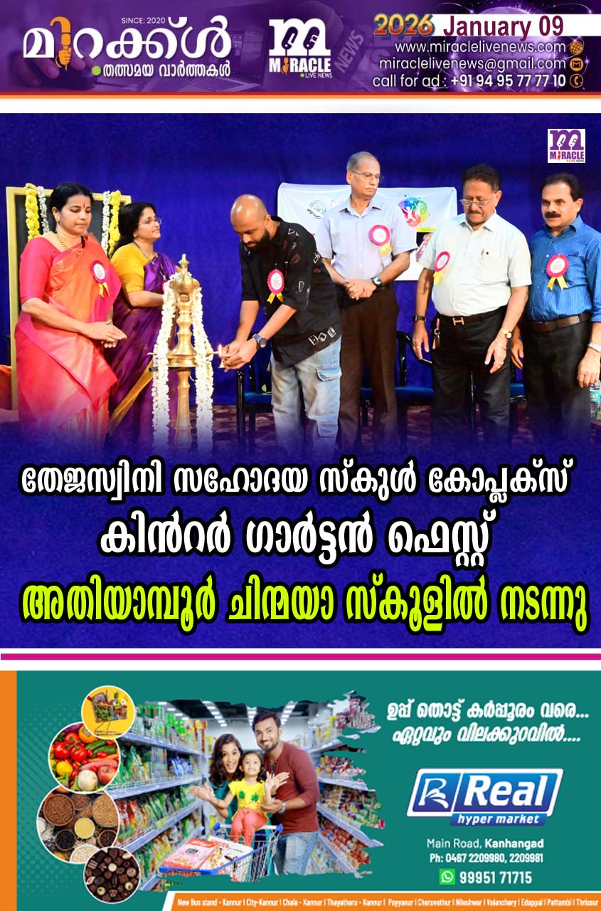 കാഞ്ഞങ്ങാട് : കുരുന്നുകളുടെ കലാപ്രകടനങ്ങള് കണ്ടെത്തുന്നതിനും അവ തുടക്കത്തിലേ പ്രോത്സാഹിപ്പിക്കുന്നതിനുമായി കണ്ണൂര് കാസര്കോട് ജില്ലയിലെ സി ബി എസ് സി സ്കൂളുകളില് നിന്നും സഹോദയാ കോപ്ലക്സില് അംഗങ്ങളായ വിദ്യാലയങ്ങളിലെ കെജി കുട്ടികളെ പങ്കെടുപിച്ചു കൊണ്ടുള്ള കണ്ണൂര് കാസര്കോട് ജില്ല തേജസ്വിനി സഹോദയ സ്കൂള് കോംപ്ലക്സ് കിന്റര് ഗാര്ട്ടന് ഫെസ്റ്റ് 2026 അതിയാമ്പൂര് ചിന്മയാ വിദ്യാത്തില് നടന്നു. മൂന്ന് വേദികളിലായി 19ഇനങ്ങളിലായി വിവിധ വിദ്യാലയങ്ങളില് നിന്നും 185 – കുരുന്നുകള് വിവിധ മത്സര ഇനങ്ങളില് പങ്കെടുത്തു. ഗസല് ഗായകന് അലോഷി ഉദ്ഘാടനം ചെയ്തു . മത്സര വിജയത്തിനപ്പുറത്ത് മത്സരിക്കുമ്പോള് ലഭിക്കുന്ന കൈയടികളാണ് ഏറ്റവും മഹത്തായത് എന്നും അതിനാല്കലയിലേക്ക് ചുവടുവെക്കുന്ന കുട്ടികള്ക്ക് എല്ലാവരുടേയും അനുഗ്രഹം ഉണ്ടാകണമെന്ന് ഗസല് ഗായകന് പറഞ്ഞു. സ്കൂള് സെക്രട്ടറി ബാബുരാജേന്ദ്ര ഷേണായി അധ്യക്ഷത വഹിച്ചു . ബ്രിഗേഡിയര്. ടി കെ പ്രഭാകരന് നായര് , വൈസ് പ്രിന്സിപ്പാള് പി.കെ മിനി എന്നിവര് സംസാരിച്ചു . സഹോദയ പ്രസിഡണ്ടും സ്കൂള് പ്രിന്സിപ്പാളുമായ സി. ചന്ദ്രന് സ്വാഗതവും പ്രോഗ്രാം കോഡിനേറ്റര് ഗീതരാമകൃഷ്ണന് നന്ദിയും പറഞ്ഞു. വിജയികള്ക്കും മത്സരത്തില് പങ്കെടുത്ത മുഴുവന് കുട്ടികള്ക്കും ട്രോഫിയും സര്ട്ടിഫിക്കറ്റും നല്കി.