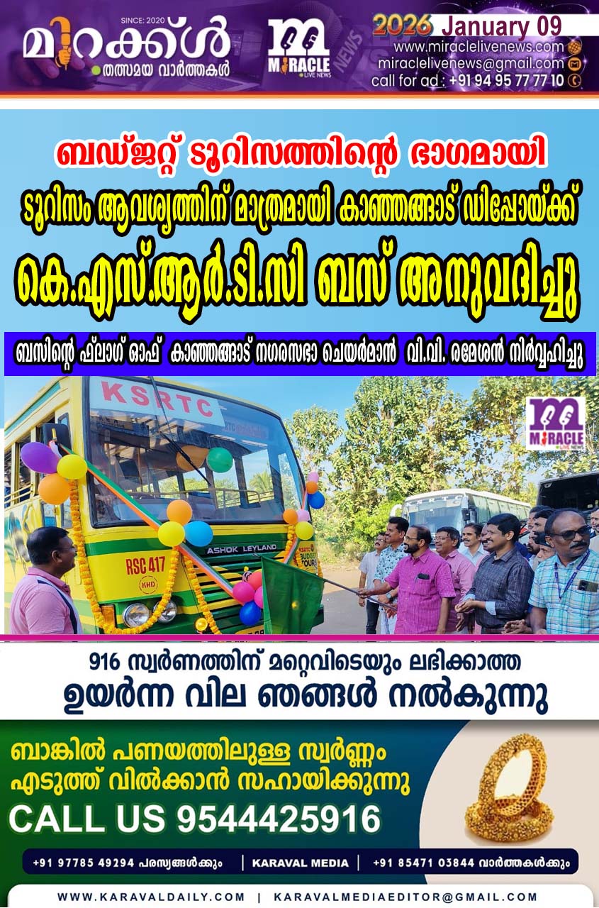 കാഞ്ഞങ്ങാട്: കെ.എസ്.ആര്‍.ടി.സി ബഡ്ജറ്റ് ടൂറിസത്തിന്റെ ഭാഗമായി ടൂറിസം ആവശ്യത്തിന് മാത്രമായി കാഞ്ഞങ്ങാട് ഡിപ്പോയ്ക്ക് അനുവദിച്ച ആദ്യ ബസിന്റെ ഫ്‌ലാഗ് ഓഫ് കാഞ്ഞങ്ങാട് നഗരസഭാ ചെയര്‍മാന്‍ വി.വി. രമേശന്‍ നിര്‍വ്വഹിച്ചു. കാഞ്ഞങ്ങാട് ചെമ്മട്ടംവയല്‍ കെ.എസ്.ആര്‍.ടി.സി ഡിപ്പോയില്‍ നടന്ന ചടങ്ങില്‍ അസിസ്റ്റന്റ് ട്രാന്‍സ്‌പോര്‍ട്ട് ഓഫീസര്‍ ആല്‍വിന്‍ ടി സേവ്യര്‍ അധ്യക്ഷത വഹിച്ചു. ബഡ്ജറ്റ് ടൂറിസം സെല്‍ കോര്‍ഡിനേറ്റര്‍ കെ. പ്രദീപ്കുമാര്‍ സ്വാഗതം പറഞ്ഞു. അസിസ്റ്റന്റ് ഡിപ്പോ എഞ്ചിനീയര്‍ വി.എച്ച്. ദാമോദരന്‍, കണ്‍ ട്രോളിംഗ് ഇന്‍സ്‌പെക്ടര്‍ കെ.എ. കൃഷ്ണന്‍ കെ.എസ്.ആര്‍.ടി.സി ട്രേഡ് യൂണിയന്‍ പ്രതിനിധികള്‍ പൊതു പ്രവര്‍ത്തകരായ പി.നന്ദകുമാര്‍ , പി.രാജു, ബഡ്ജറ്റ് ടൂറിസം സെല്ലിന്റെ സ്ഥിരം യാത്രക്കാരുടെ പ്രതിനിധികളായ രാധാകൃഷ്ണന്‍, ജയരാജന്‍ തുടങ്ങിയവര്‍ സംസാരിച്ചു. കാഞ്ഞങ്ങാട് മുനിസിപ്പല്‍ ഓഫീസിന് മുന്നില്‍ നഗരസഭാ കൗണ്‍സിലര്‍മാരും ജീവനക്കാരും സ്വീകരണം നല്‍കി. കെ.എസ്. ആര്‍.ടി.സിയുടെ വികസനവുമായി ബന്ധപ്പെട്ട് കാഞ്ഞങ്ങാട് ഡിപ്പോയ്ക്ക് നഗരസഭയുടെ ഭാഗത്തു നിന്നും എല്ലാ സഹകരണവും നഗരസഭാ ചെയര്‍മാന്‍ വാഗ്ദാനം ചെയ്തു. പൂര്‍ണമായും പുതിയ ബസ്റ്റാന്റ് കേന്ദ്രീകരിച്ച് ബസ് സര്‍വ്വീസ് ഉടന്‍ പ്രാവര്‍ത്തിക മാകുമെന്നും അപ്പോള്‍ ടൗണ്‍ കേന്ദ്രീകരിച്ച് ജില്ലാ ആശുപത്രി വഴി സര്‍ക്കുലര്‍ സര്‍വീസ് ആരംഭിക്കണമെന്ന നഗരസഭാ ചെയര്‍മാന്റെ നിര്‍ദ്ദേശം നടപ്പിലാക്കുമെന്ന് കെ.എസ്. ആര്‍.ടി.സി അധികൃതര്‍ അറിയിച്ചു. 2024 നവംബറില്‍ ആരംഭിച്ച കാഞ്ഞങ്ങാട് കെ.എസ്.ആര്‍.ടി.സി യുടെ ബഡ്ജറ്റ് ടൂറിസം സെല്‍ ഇതുവരെ ഏകദിന വിനോദ യാത്രകളും ദീര്‍ഘദൂര വിനോദയാത്രകളും വിവാഹ- തീര്‍ത്ഥാടനയാത്രകളും, ഉള്‍പ്പെടെ 152 ട്രിപ്പുകള്‍ ഓപ്പറേറ്റ് ചെയ്തു അമ്പത് ലക്ഷം രൂപ ഡിപ്പോയ്ക്ക് ടിക്കറ്റിതര വരുമാനമായി നേടി. ചുരുങ്ങിയ ചെലവില്‍ ജനകീയമായ ബഡ്ജറ്റ് ടൂറിസം സെല്ലിന് വലിയ ഫാന്‍സ് ഗ്രൂപ്പുകളടക്കം സജീവമാണ്.