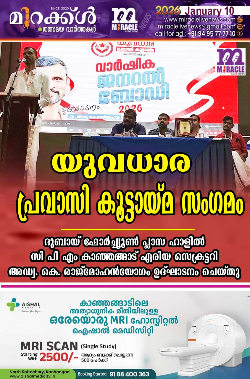 യുവധാര പ്രവാസി കൂട്ടായ്മ സംഗമം; ദുബായ് ഫോര്‍ച്ച്യൂണ്‍ പ്ലാസ ഹാളില്‍ സി പി എം കാഞ്ഞങ്ങാട് ഏരിയ സെക്രട്ടറി അഡ്വ. കെ. രാജ്‌മോഹന്‍യോഗം ഉദ്ഘാടനം ചെയ്തു