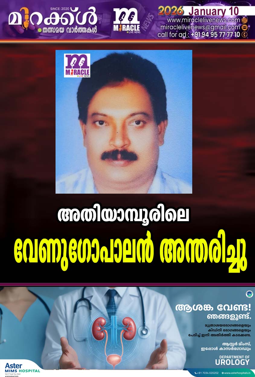 കാഞ്ഞങ്ങാട്: വൃക്ക സംബന്ധമായ അസുഖത്തെ തുടര്ന്ന് ചികിത്സയില് ഉണ്ടായിരുന്ന അതിയാമ്പൂര് ഗംഗ നിവാസിലെ വേണുഗോപാലന്(64)അന്തരിച്ചു.പരേതനായ ഗംഗാധരന്റെയും ജാനുവിന്റെയും മകനാണ്.ഭാര്യ:അമല.മക്കള്:അനുശ്രീ വേണുഗോപാല്, ആനന്ദ് വേണുഗോപാല്, സഹോദരങ്ങള്:സേതു(അതിയാമ്പൂര്), വിമല(കല്യാണ് റോഡ്),മധു(അതിയാമ്പൂര്),നിര്മ്മല(പള്ളിക്കര).