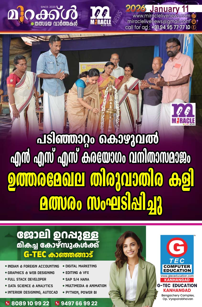 നീലേശ്വരം: പടിഞ്ഞാറ്റം കൊഴുവല് എന് എസ് എസ് കരയോഗം വനിതാസമാജം ഉത്തരമേഖല തിരുവാതിര കളി മത്സരം സംഘടിപ്പിച്ചു. മത്സരം സംസ്ഥാന പ്രഥമയുവ പ്രതിഭ പുരസ്കാര ജേതാവും, ലാസ്യ കോളേജ് പയ്യന്നൂര് അസിസ്റ്റന്റ് പ്രൊഫസറുമായ ഹരിത തമ്പാന് ഉദ്ഘാടനം ചെയ്തു. സംഘാടകസമിതി ചെയര്പേഴ്സണ് എം. പങ്കജാക്ഷി അധ്യക്ഷത വഹിച്ചു. വാര്ഡ് കൗണ്സിലര്മാരായ പി.വിനോദ് കുമാര്, വി.രാജം, എന് എസ് എസ് കരയോഗം സെക്രട്ടറി കെ. എം ഗോപാലകൃഷ്ണന് നായര്, പ്രോഗ്രാം കമ്മിറ്റി ചെയര്മാന് എം. മധുസൂദനന്, പ്രോഗ്രാം കമ്മിറ്റി കണ്വീനര് ആനന്ദവല്ലി ടീച്ചര് തുടങ്ങിയവര് സംസാരിച്ചു. മത്സരത്തിന് മുന്നോടിയായി അഭിരാം പി നായര് അവതരിപ്പിച്ച വയലിന് കച്ചേരി ആസ്വാദകരുടെ ശ്രദ്ധ പിടിച്ചുപറ്റി. സമാപന സമ്മേളനത്തില് എന് എസ് എസ് കരയോഗം പ്രസിഡന്റ് കെ.പി. ജയരാജന് നായര് അധ്യക്ഷത വഹിച്ചു. ആലപ്പുഴ എസ്.ഡി.കോളേജ് അസോസിയേറ്റ് പ്രൊഫസര് ഡോ. സജിത്ത് ഏവൂരെത്ത് ‘ തിരുവാതിര ആചാരങ്ങളും അനുഷ്ഠാനങ്ങളും’ എന്ന വിഷയത്തില് മുഖ്യപ്രഭാഷണം നടത്തി. കരിപ്പോത്ത് പുഷ്പവല്ലി , ബിന്ദു പി നായര്, എം പങ്കജാക്ഷി എന്നിവര് വിജയികള്ക്കുള്ള സമ്മാനങ്ങള് വിതരണം ചെയ്തു. ടി.വി. സരസ്വതി ടീച്ചര്, പി എം ഭാനുമതിയമ്മ, കെ.എം. അനിത, കെ.വി. രാമദേവി, തുടങ്ങിയവര് സംസാരിച്ചു. വിജയികള്. ഒന്നാം സ്ഥാനം ശ്രീപാര്വ്വതി തൃക്കരിപ്പൂര്, രണ്ടാം സ്ഥാനം താളം കണ്ണൂര്, മൂന്നാം സ്ഥാനം നെഹ്റു ബാലവേദി സര്ഗ്ഗവേദി വെള്ളിക്കോത്ത്.