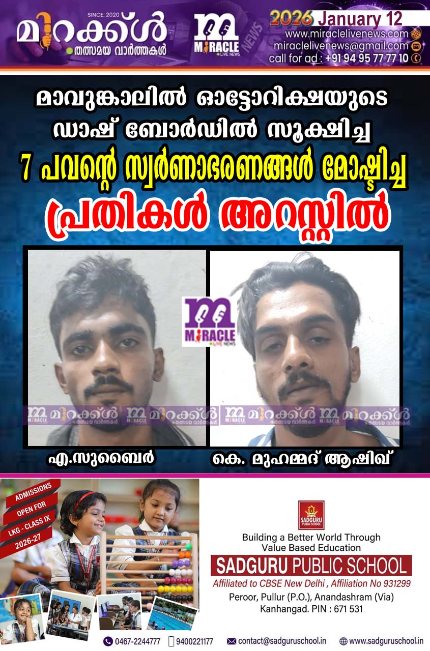 കാഞ്ഞങ്ങാട്: ഓട്ടോറിക്ഷയുടെ ഡാഷ് ബോര്ഡില് സൂക്ഷിച്ച 7 പവന്റെ സ്വര്ണാഭരണങ്ങള് മോഷ്ടിച്ച പ്രതികളെ ഇന്സ്പെക്ടര് ഇ. അനൂബ് കുമാറിന്റെ നേതൃത്വത്തിലുള്ള അന്വേഷണം സംഘം അറസ്റ്റ് ചെയ്തു. കള്ളാര് ഒക്ലാവിലെ എ.സുബൈര് (23), കാഞ്ഞങ്ങാട് വടകരമുക്കിലെ കെ.എം കെ. കോര്ട്ടേഴ്സില് താമസിക്കുന്ന കെ. മുഹമ്മദ് ആഷിഖ് (28) എന്നിവരെയാണ് ഹോസ്ദുര്ഗ് പോലീസ് അറസ്റ്റ് ചെയ്തത്. വെള്ളിയാഴ്ച ഉച്ചക്കാണ് മാവുങ്കാലിലെ സഞ്ജീവനി ഹോസ്പിറ്റല് മുന്വശം നിര്ത്തിയിട്ട ബളാല് കല്ലഞ്ചിറയിലെ കുതിരുമ്മല് അഷറഫിന്റെ ഓട്ടോയില് നിന്നു പ്രതികള് 7 പവന്റെ സ്വര്ണ വളകള് പ്രതികള് മോഷ്ടിച്ചത്. അഷറഫിന്റെ ഭാര്യാപിതാവ് കോളിച്ചാലിലെ പി. അബ്ദുള്ള വീണ് പരിക്കേറ്റ് തുടയെല്ല് പൊട്ടിയിരുന്നു. വിവരമറിഞ്ഞ് അഷറഫും ഭാര്യ കൗലത്തും കോ ളിച്ചാലിലെത്തി അബ്ദുള്ളയെ കൂട്ടി ആസ്പത്രിയിലേക്കു തിരിച്ചു. അബ്ദുള്ളയുടെ ഭാര്യ ആസിയയും മകന്റെ ഭാര്യ നിസ്രിയയും ഒപ്പമുണ്ടായിരുന്നു. വീടിന് അടച്ചുറപ്പില്ലാത്തതിനാല് അവിടെ സൂക്ഷിച്ചിരുന്ന സ്വര്ണവളകളും കൈയിലെടുത്തു. ആശുപത്രിയിലെത്തിയ ഇവര് സ്വര്ണം ഓട്ടോറിക്ഷയുടെ ഡാഷ് ബോര് ഡില്വെച്ച് പൂട്ടി. അബ്ദുള്ളയെ അഡ്മിറ്റ് ചെയ്ത് രണ്ടുമണിക്കൂറിനു ശേഷം തിരികെ വന്ന് നോക്കിയപ്പോള് ഡാഷ്ബോര്ഡ് കു ത്തിത്തുറന്ന നിലയിലായിരുന്നു. സ്വര്ണം നഷ്ടപ്പെട്ട വിവരം ആശുപത്രി അധികൃതരെ അറിയിക്കുകയും ചെയ്തു. ഒരാള് ഓട്ടോറിഷയുടെ മുന് സീറ്റിലേക്ക് കയറുന്നതടക്കമുള്ള ദൃശ്യങ്ങള് ആശുപത്രിയിലെ സിസിടിവിയില് പതിഞ്ഞിരുന്നു. ഇതാണ് പ്രതികളിലേക്ക് വേഗത്തിലെത്താന് പോലീസിന് സഹായമായത്.എസ്ഐ ശാര്ങ്ധരന്, എഎസ്ഐ മാരായ സുനില്കുമാര്, സുഗുണന്, ആനന്ദകൃഷ്ണന്, സീ നിയര് സിവില് പോലീസ് ഓഫീസര് കെ.ടി.അനില് ,ബിജു എന്നിവരടങ്ങുന്ന സംഘം അന്വേഷണം നടത്തി അമ്പലത്തറയില് വെച്ച് സുബൈറിനെ പിടികൂടിയത് .ഇയാളുടെ മൊഴിക്ക് പിന്നാലെ കാഞ്ഞങ്ങാട് വട കരമുക്കിലെത്തിയ പോലീസ് നിരവധി കഞ്ചാവ് കേസില് പ്രതിയായ ആഷിഖിനെ പിടികൂടുകയും ഇയാളുടെ വീട്ടില് സൂക്ഷിച്ച ഏഴുസ്വര്ണവളകളും കണ്ടടുക്കുയും ചെയ്തു. ആഷിഖ് കവര്ച്ച ഉള്പ്പെടെ നിരവധി കേസുകളിലെ പ്രതിയാണെന്ന് പോലീസ് പറഞ്ഞു.