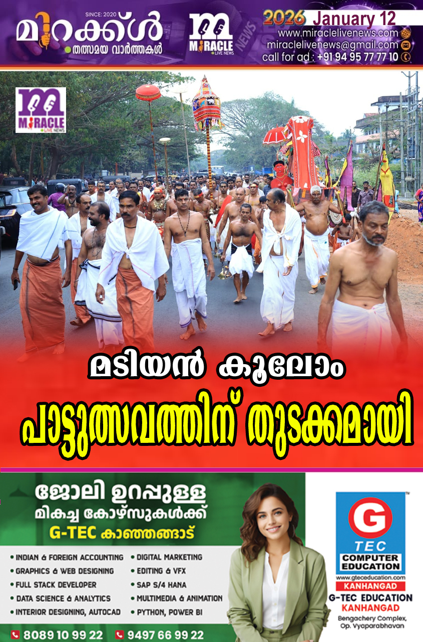 കാഞ്ഞങ്ങാട്: ഉത്തര കേരളത്തിലെ ചരിത്രപ്രസിദ്ധമായ ശ്രീ മടിയന് കൂലോം പാട്ടുത്സവത്തിന് തുടക്കമായി. പാട്ട് ഉത്സവത്തിന്റെ ഒന്നാം ദിനമായ ഞായറാഴ്ച വൈകിട്ട് അജാനൂര് കുറുംമ്പ ഭഗവതി ക്ഷേത്രത്തില് നിന്നുള്ള തെയ്യം വരവ് നടന്നു. പാട്ടുത്സവത്തിന്റെ രണ്ടാം ദിനമായ തിങ്കളാഴ്ച വൈകിട്ട് നേരോത്ത് ശ്രീ പെരട്ടൂര് കൂലോം, ശ്രീ മുളവന്നൂര് ഭഗവതി ക്ഷേത്രം, ശ്രീ കല്ല്യാല് മുച്ചിലോട്ട് ഭഗവതി ക്ഷേത്രം എന്നിവിടങ്ങളില് നിന്നുള്ള തെയ്യം വരവ് നടക്കും. പാട്ട് ഉത്സവം ജനുവരി 15ന് സമാപിക്കും.