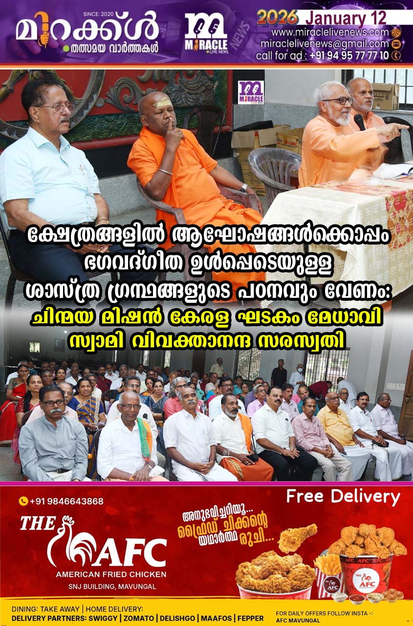 ക്ഷേത്രങ്ങളില്‍ ആഘോഷങ്ങള്‍ക്കൊപ്പം ഭഗവദ്ഗീത ഉള്‍പ്പെടെയുള്ള ശാസ്ത്ര ഗ്രന്ഥങ്ങളുടെ പഠനവും വേണം: ചിന്മയ മിഷന്‍ കേരള ഘടകം മേധാവി സ്വാമി വിവക്താനന്ദ സരസ്വതി