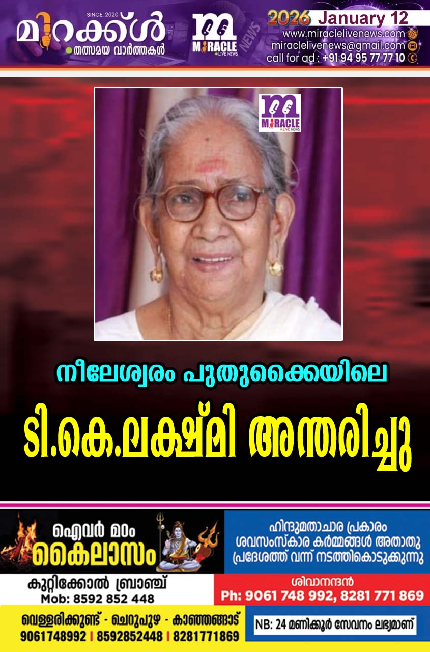 നീലേശ്വരം: പുതുക്കൈയിലെ ടി.കെ. ലക്ഷ്മി (95) അന്തരിച്ചു.ഭര്ത്താവ്: പരേതനായ പി.വി. കുഞ്ഞിരാമന്. മക്കള്: ടി.കെ.രാധ, ടി.കെ.ബാലകൃഷ്ണന്, ടി.കെ.രവി (ഇരുവരും റിട്ട. ആരോഗ്യ വകുപ്പ്), ടി.കെ.ഗംഗാധരന് (റിട്ട. സിപിസിആര്ഐ), ടി.കെ.രജിത (കണ്ണൂര്). മരുമക്കള്: സി.ജി.രാധ, കെ.വി.ശൈലജ, സി.വി. സുനി (ആരോഗ്യ വകുപ്പ്), കെ.വി.ശശിധരന് (ബിസിനസ്), പരേതനായ ആര്.കെ.ബാലന് (കരുമല). സഹോദരങ്ങള്: മീനാക്ഷി, ജാനകി, പരേതരായ ശങ്കരന്, കാര്ത്യായനി.സംസ്കാരം ഇന്ന് വൈകീട്ട് ചിറപ്പുറം വാതക ശ്മശാനത്തില്.