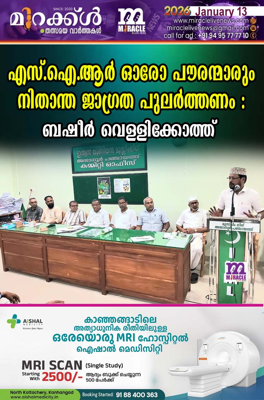 അജാനൂര്‍ : എസ്.ഐ.ആര്‍ പ്രകാരം പുറത്ത് വന്ന കരട് പട്ടിക സംബന്ധമായി വിശദമായ പരിശോധന നടത്തുവാനും, ആവിശ്യമായ തീരുമാനം എടുക്കുവാനും മുസ്ലിം ലീഗ് അജാനൂര്‍ പഞ്ചായത്ത് കമ്മിറ്റി പ്രത്യേക ജാഗ്രതാ യോഗം സംഘടിപ്പിച്ചു. വൈസ് പ്രസിഡന്റ് കപ്പണക്കാല്‍ മുഹമ്മദ് കുഞ്ഞിയുടെ അധ്യക്ഷതയില്‍ മുസ്ലിം ലീഗ് സംസ്ഥാന സെക്രെട്ടറിയേറ്റ് മെമ്പറും കാഞ്ഞങ്ങാട് നിയോജക മണ്ഡലം പ്രസിഡന്റുമായ ബഷീര്‍ വെള്ളിക്കോത്ത് ഉദ്ഘാടനം ചെയ്തു. സമഗ്ര വോട്ടര്‍ പട്ടിക പരിഷകരണം ഈ മാസം 22 ന് അവസാനിക്കാനിരിക്കെ 18 വയസ്സ് തികഞ്ഞ അവസാനത്തെ മനുഷ്യനും വോട്ടര്‍ പട്ടികയില്‍ പെട്ടുവെന്നുറപ്പ് വരുത്താന്‍ മുസ്ലിം ലീഗിന്റെയും പോഷക ഘടകങ്ങളുടെയും വാര്‍ഡ് ശാഖാ കമ്മിറ്റികളും തങ്ങളും തങ്ങളുടെ കുടുംബാംഗങ്ങളും വോട്ടര്‍ പട്ടികയില്‍ ഉള്‍പ്പെടുന്നുവെന്ന് ബോധ്യം വരും വരെ ഓരോ പൗരന്മാരും നിതാന്ത ജാഗ്രത പുലര്‍ത്തണമെന്ന് ബഷീര്‍ വെള്ളിക്കോത്ത് ആഹ്വാനം ചെയ്തു. എസ് ഐ ആര്‍ വോട്ടര്‍ പട്ടിക പരിഷ്‌കരണമെന്നതിനപ്പുറം പൗരത്വ രേഖയായി പരിഗണിക്കപ്പെടുമെന്ന വെല്ലുവിളി നിലനില്‍ക്കുമ്പോള്‍ മോഡി സര്‍ക്കാര്‍ നടപ്പാക്കിയ പൗരത്വ ഭേദഗതി നിയമപ്രകാരം പൗരത്വം നിഷേധിക്കപ്പെടാനിടയുള്ളത് മുസ്ലിംകളാണെന്നുള്ളത് ആ സമൂഹം ഇക്കാര്യത്തില്‍ പുലര്‍ത്തേണ്ട കരുതല്‍ അനിവാര്യമാക്കുന്നുവെന്നദ്ദേഹം തുടര്‍ന്നു പറഞ്ഞു. ജനറല്‍ സെക്രട്ടറി ബഷീര്‍ ചിത്താരി സ്വാഗതം പറഞ്ഞു. പ്രസിഡന്റ് മുബാറക്ക് ഹസൈനാര്‍ ഹാജി,പ്രവാസി ലീഗ് ജില്ലാ പ്രസിഡന്റ് എ. പി. ഉമര്‍,മണ്ഡലം വൈസ് പ്രസിഡന്റ് ഹമീദ് ചേരെക്കാടത്ത്, സെക്രട്ടറി സി.എച്ച്. ഹംസ, ശംസുദ്ധീന്‍ മാട്ടുമ്മല്‍, കെഎംസിസി നേതാക്കളായ സി.ബി. കരീം,നജീബ് പീടികയില്‍,യൂത്ത് ലീഗ് മണ്ഡലം ട്രഷറര്‍ ജബ്ബാര്‍ ചിത്താരി,പി. എച്ച്. അയ്യൂബ്,സി. എച്ച്.അബൂബക്കര്‍ ഹാജി,ഫൈസല്‍ ചിത്താരി,സി. എച്ച്. നിസാമുദ്ധീന്‍ തുടങ്ങിയവര്‍ ചര്‍ച്ചയില്‍ പങ്കെടുത്തു.