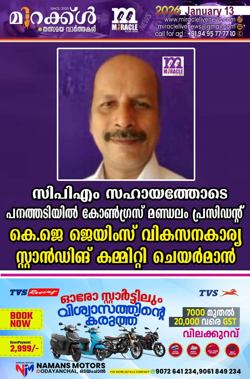 പാണത്തൂര്: പനത്തടി ഗ്രാമപഞ്ചായത്തില് ഇന്ന് നടന്ന സ്റ്റാന്ഡിങ് കമ്മിറ്റി ചെയര്മാന് തിരഞ്ഞെടുപ്പില് സിപിഎം സഹായത്തോടെ കോണ്ഗ്രസ് മണ്ഡലം പ്രസിഡണ്ട് വികസനകാര്യ സ്റ്റാന്ഡിങ് കമ്മിറ്റി ചെയര്മാനായി തിരഞ്ഞെടുക്കപ്പെട്ടു. കോണ്ഗ്രസ് മണ്ഡലം പ്രസിഡന്റും,ഒമ്പതാം വാര്ഡ് മെമ്പറുമായ കെ.ജെ ജെയിംസാണ് ഒന്നിനെതിരെ മൂന്നു വോട്ടുകള് നേടി വികസനകാര്യ സ്റ്റാന്ഡിങ് കമ്മിറ്റി ചെയര്മാനായി തിരഞ്ഞെടുക്കപ്പെട്ടത്. എതിര് സ്ഥാനാര്ത്ഥിയായി മത്സരിച്ച ബി.ജെ.പിയിലെ കെ.കെ വേണുഗോപാലിന് ഒരു വോട്ടാണ് ലഭിച്ചത്. ദിവസങ്ങള്ക്ക് മുമ്പ് നടന്ന സ്റ്റാന്ഡിങ് കമ്മിറ്റി തെരഞ്ഞെടുപ്പില് വികസനകാര്യ സ്റ്റാന്ഡിങ് കമ്പനിയിലേക്ക് സി.പി.എമ്മില് നിന്ന് രണ്ട് മെമ്പര്മാരും കോണ്ഗ്രസില് നിന്നും, ബി.ജെ.പിയില് നിന്നും ഓരോ അംഗങ്ങളും തിരഞ്ഞെടുക്കപ്പെട്ടിരുന്നു. ഇന്ന് നടന്ന ചെയര്മാന് തെരഞ്ഞെടുപ്പില് സിപിഎമ്മിന്റെ മെമ്പര്മാരായ സി ബാലകൃഷ്ണനും, ഐ.സി ഐസക്കും കോണ്ഗ്രസ്സിന്റെ സ്ഥാനാര്ത്ഥിയായി മല്സരിച്ച തന്റെ തന്നെ വോട്ടും ജയിംസിന് ലഭിച്ചു. സി.പി.എം ചാമുണ്ടിക്കുന്ന് ലോക്കല് കമ്മിറ്റി അംഗമാണ് സി ബാലകൃഷ്ണന്, ഐ.സി ഐസക്ക് സിപിഎം അരിപ്രോട് ബ്രാഞ്ച് സെക്രട്ടറിയുമാണ്. നേരത്തെ സി.പി.എമ്മും കോണ്ഗ്രസും തമ്മിലുണ്ടാക്കിയ ധാരണ പ്രകാരമാണ് സ്റ്റാന്ഡിങ് കമ്മിറ്റി ചെയര്മാന് സ്ഥാനം ജെയിംസിന് ലഭിച്ചത്. ആര്ക്കും ഭൂരിപക്ഷമില്ലാത്ത പഞ്ചായത്തില് മുഖ്യപ്രതിപക്ഷമായ യു.ഡി.എഫിനെ കൂടെ കൂട്ടിയത് വഴി ഭീഷണിയില്ലാതെ അഞ്ചു വര്ഷക്കാലം ഭരിക്കാമെന്ന സി.പി.എമ്മിന്റെ തന്ത്രമാണ് ഇതോടെ പ്രാവര്ത്തികമായത്.