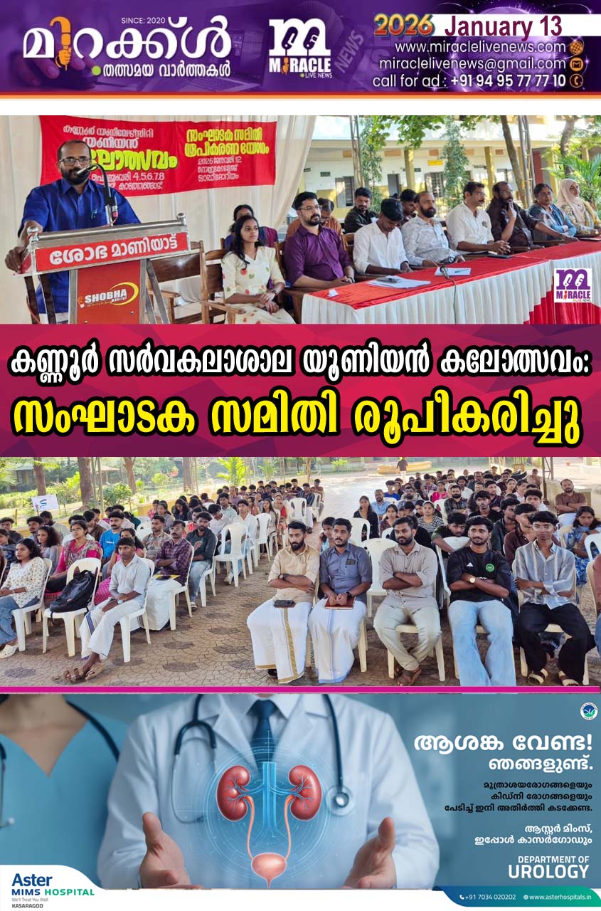 കാഞ്ഞങ്ങാട്: ഫെബ്രുവരി 4 മുതല് 8 വരെ പടന്നക്കാട് നെഹ്റു ആര്ട്സ് ആന്റ് സയന്സ് കോളേജില് വച്ച് നടക്കുന്നകണ്ണൂര് സര്വകലാശാല യൂണിയന് കലോത്സവം വിജയിപ്പിക്കുന്നതിനായി സംഘാടക സമിതി രൂപീകരിച്ചു. കാഞ്ഞങ്ങാട് നഗരസഭ ചെയര്മാന് വി.വി രമേശന് ഉദ്ഘാടനം ചെയ്തു. യൂണിയന് വൈസ് ചെയര്മാന് ദില്ജിത് അധ്യക്ഷനായി.കണ്ണൂര് സര്വകലാശാല സിന്ഡിക്കേറ്റ് അംഗങ്ങളായ ഡോ. എ .അശോകന് , സജിത്ത് കുമാര് പലേരി , മുന്സിപ്പാലിറ്റി ക്ഷേമകാര്യ സ്റ്റാന്ഡിംഗ് കമ്മിറ്റി ചെയര്പേഴ്സണ്