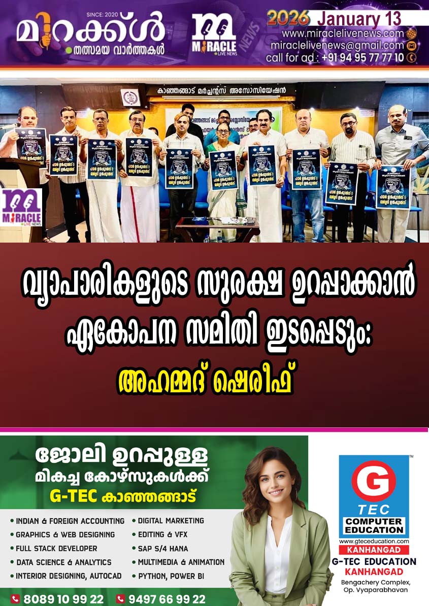 കാഞ്ഞങ്ങാട്: വ്യാപാരികളുടെ നില നില്പ്പ് തന്നെയും ചോദ്യം ചെയ്യ പ്പെടുന്ന വര്ത്തമാന കാലത്ത് കച്ചവട രംഗം സുരക്ഷിതമാക്കാന് വ്യാപാരി വ്യവസായി ഏകോപന സമിതി ശക്തമായി ഇടപ്പെടു മെന്ന് സംസ്ഥാന വൈസ് പ്രസിഡന്റ് കെ അഹമ്മദ് ഷെരീഫ്.കുത്തകക ളെ സംരക്ഷിക്കാനും അവരെ സഹായിക്കാനുമുള്ള നിലപാടാണ് കേന്ദ്ര സര്ക്കാര് എടുക്കുന്നത്. സംസ്ഥാന സര്ക്കാറി ന്റെ സമീപനവും വിത്യസ്തമല്ല. സാധാരണകാരായ കച്ചവടക്കാര് അവഗണിക്ക പ്പെടുകയാണെന്ന് കാഞ്ഞങ്ങാട് മര്ച്ചന്റ് അ സോസി യേഷ ന്റെ വ്യാപാര ഇന്ഷൂറന്സ് സുരക്ഷാപദ്ധതി പ്രഖ്യാപനം നിര്വഹിച്ച് അഹമ്മദ് ഷെരീഫ് പറഞ്ഞു. മര്ച്ചന്റ് അസോസി യേഷന് നടപിലാക്കിയ കുടുംബ ക്ഷേമ പദ്ധതി മാതൃകപരമാണ്. പുതുതായി ആരംഭിക്കുന്ന പദ്ധതിയും വ്യാപാരികള്ക്ക് ഏ റെ ഗുണകരമായിരിക്കു മെന്നും അദ്ദേഹം പറഞ്ഞു. മര്ച്ചന്റ് അ സോസിയേഷന് മുന് പ്രസിഡന്റ് ഗോകുല്ദാസ് കമ്മത്ത് വ്യാപാരി ഇന്ഷൂറന്സ് സുരക്ഷ പദ്ധതി ഉദ്ഘാടനം ചെയ്തു. കെ.എംഎ പ്രസിഡന്റ് സി.കെ ആസിഫ് അധ്യക്ഷത വഹിച്ചു. ജന.സെക്രട്ടറി ഐശ്വര്യ കുമാരന് സ്വാഗതവും ട്രഷറര് ആസിഫ് മെട്രോ നന്ദിയും പറഞ്ഞു.