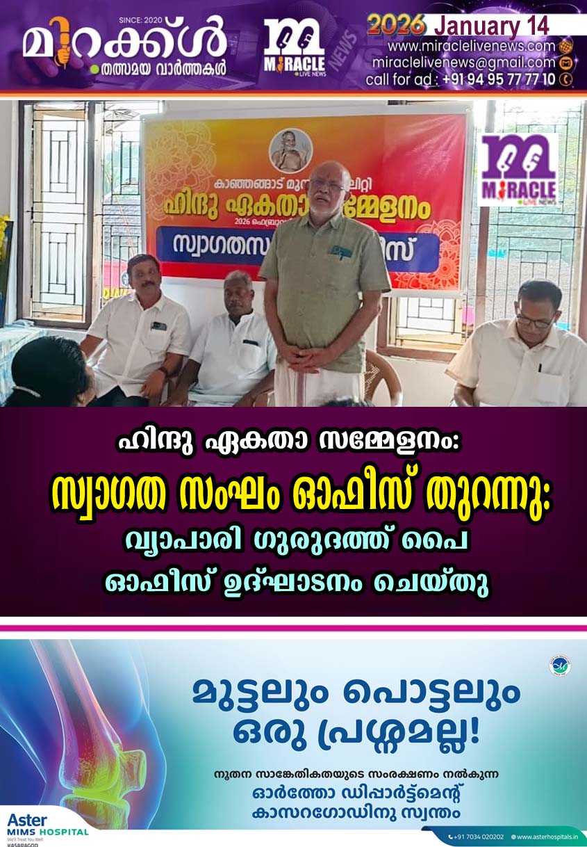 കാഞ്ഞങ്ങാട്: ഫെബ്രുവരി 8 ന് കാഞ്ഞങ്ങാട് നടക്കുന്ന കാഞ്ഞങ്ങാട് മുനിസിപ്പാലിറ്റി ഹിന്ദു ഏകത സമ്മേളനത്തിൻ്റെ സ്വാഗത സംഘം ഓഫീസ് തുറന്നു. കാഞ്ഞങ്ങാട്ടെ പ്രമുഖ വ്യാപാരി ഗരുദത്ത് പൈ ഓഫീസ് ഉദ്ഘാടനം നിർവ്വഹിച്ചു. സ്വാഗത സംഘം ചെയർമാൻ അഡ്വ. പി.അരവിന്ദൻ അധ്യക്ഷത വഹിച്ചു. ജില്ലാ സയോജക് പി. കൃഷ്ണൻ ഏച്ചിക്കാനം മുഖ്യ പ്രഭാഷണം നടത്തി. കാഞ്ഞങ്ങാട് സംയോജക് ടി.വി. അശോകൻ, കെ.വി. രാജൻ എന്നിവർ സംസാരിച്ചു. സുനിൽ കല്ലൂരാവി സ്വാഗതവും ജനറൽ സെക്രട്ടറി പി.പി. ചക്രപാണി നന്ദിയും പറഞ്ഞു.