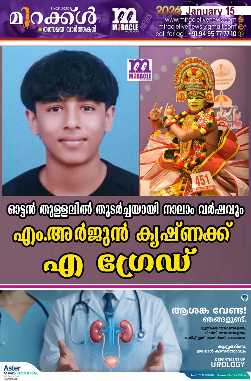 കാഞ്ഞങ്ങാട്: തൃശൂരില് നടക്കുന്ന 64മത് സംസ്ഥാന സ്കൂള് കലോത്സവത്തില് ഹയര് സെക്കന്ററി ആണ്കുട്ടികളുടെ വിഭാഗത്തില് ഓട്ടന് തുള്ളലില് തുടര്ച്ചയായി നാലാം വര്ഷവും എ ഗ്രേഡ് നേടിയാ അര്ജുന് കൃഷ്ണ. എം. ഹോസ്ദുര്ഗ് ജി എച്ച് എസ് എസ് പ്ലസ് വണ് വിദ്യാര്ത്ഥിയാണ് കുവൈത്ത് പ്രവാസിയായ സുമേഷ് രാജിന്റെയും രേണുകയുടെയും മകനാണ്. കൂത്ത്പറമ്പ് കലാമണ്ഡലം മഹേന്ദ്രന് മാഷുടെ ശിക്ഷണത്തിലാണ് ഓട്ടന് തുള്ളല് അഭ്യസിക്കുന്നത്.