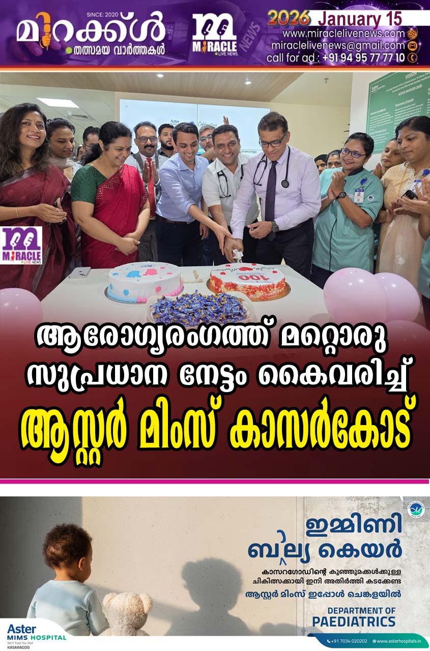 കാസര്കോട്:ആരോഗ്യരംഗത്ത് മറ്റൊരു സുപ്രധാന നേട്ടം കൈവരിച്ച് ആസ്റ്റര് മിംസ് കാസര്ഗോഡ്. ആസ്റ്റര് മിംസ് കാസറഗോഡ് തുടങ്ങി 3 മാസത്തിനുള്ളില് ആശുപത്രിയില് 100 സുരക്ഷിത പ്രസവങ്ങള്, (Safe Deliveries) കൂടാതെ 100 ആഞ്ജിയോപ്ലാസ്റ്റികളും (Angioplatsy) വിജയകരമായി പൂര്ത്തിയാക്കിയതിന്റെ ആഘോഷം ആശുപത്രിയില് നടന്നു. ഡോക്ടര്മാരും നഴ്സുമാരും മറ്റ് ജീവനക്കാരും ചടങ്ങില് പങ്കെടുത്തു.