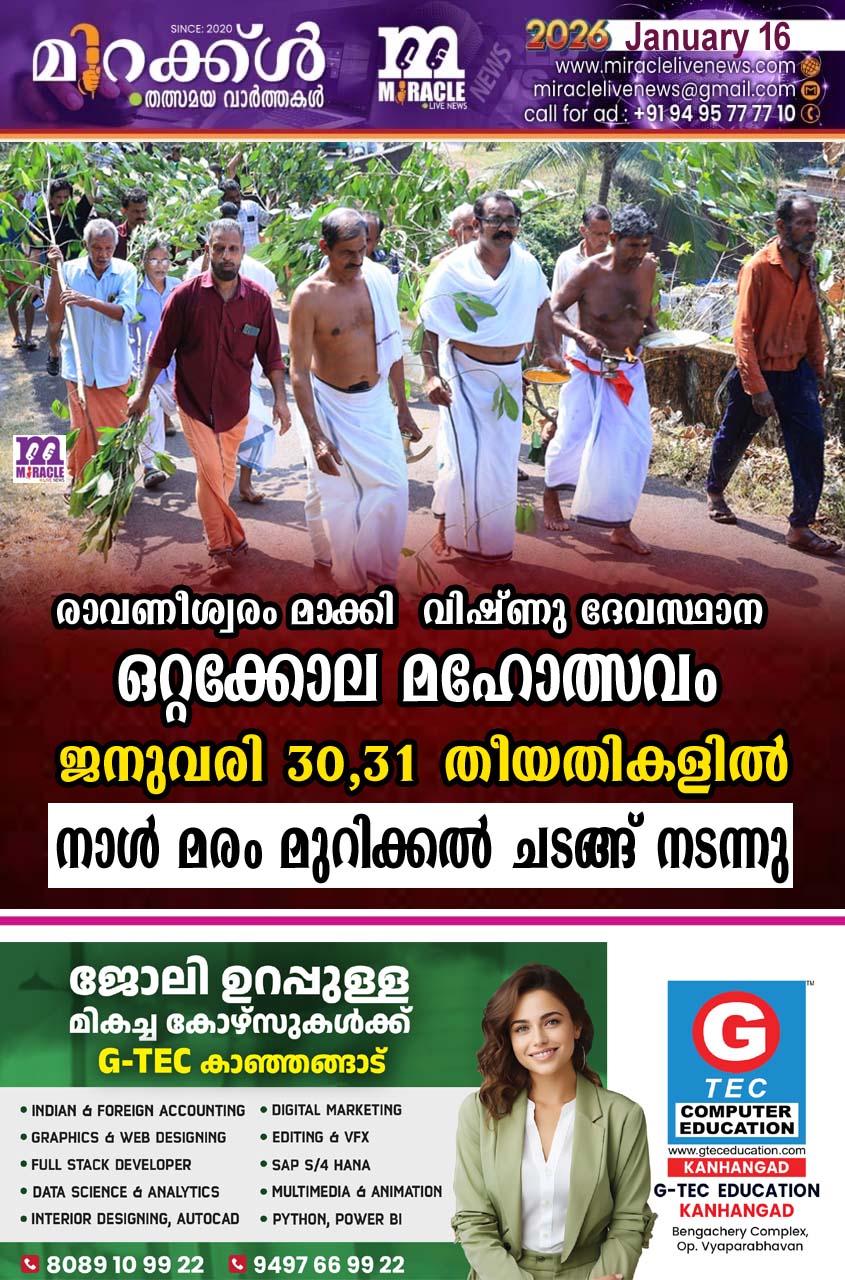 രാവണീശ്വരം: മാക്കി വിഷ്ണു ദേവസ്ഥാന ഒറ്റക്കോല മഹോത്സവം ജനുവരി 30,31 തീയതികളിലായി വിവിധ പരിപാടികളോടെ ആഘോഷിക്കും. ഒറ്റക്കോല മഹോത്സവത്തോടനുബന്ധിച്ചുള്ള നാള് മരം മുറിക്കല് ചടങ്ങ് ഭക്തി സാന്ദ്രമായ അന്തരീക്ഷത്തില് നടന്നു. ക്ഷേത്ര സ്ഥാനികരുടെയും വെളിച്ചപ്പാടന്മാരുടെയും കമ്മിറ്റി ഭാരവാഹികളുടെയും നേതൃത്വത്തില് ക്ഷേത്രത്തിലുള്ള കൂട്ട പ്രാര്ത്ഥനയ്ക്ക് ശേഷം മഹോത്സവത്തിനുള്ള നാള്മരത്തിനായുള്ള പ്ലാവ് മരം കണ്ടെത്തിയ രാവണേശ്വരം പെരുംതൃക്കോവില പ്പന് ക്ഷേത്രത്തിനു സമീപമുള്ള പ്രശാന്തി നിലയത്തിലെ എ. രാമചന്ദ്രന്റെ വളപ്പിലെത്തി ആചാര വിധിപ്രകാരമുള്ള കര്മ്മങ്ങള്ക്ക് ശേഷം നാള് മരത്തിനായുള്ള പ്ലാവുമരം മുറിച്ചെടുത്തു. തുടര്ന്ന് ഹരിനാമ സങ്കീര്ത്തന വിളികളോടെ മുറിച്ചെടുത്ത മരവും ചില്ലകളും ഘോഷയാത്രയായി ഒറ്റക്കോല മഹോത്സവം നടക്കുന്ന മാക്കി വിഷ്ണു ദേവസ്ഥാന സന്നിധിയില് എത്തിച്ചു. ഒറ്റക്കോല മഹോത്സവത്തിന്റെ ഭാഗമായി 30ന് വൈകീട്ട് ദീപവും തിരിയും എഴുന്നള്ളത്തും തുടര്ന്ന് മേലേരിക്ക് തീ കൊളുത്തലും രാത്രി 8 മണിക്ക് മാതൃ സമിതിയുടെ കൈകൊട്ടിക്കളിയും അരങ്ങേറും. രാത്രി 9 ന് ചുരിക കാസര്കോട് അവതരിപ്പിക്കുന്ന കനലാട്ടം പരിപാടി നടക്കും. തുടര്ന്ന് വിഷ്ണുമൂര്ത്തിയുടെ കുളിച്ചു തോറ്റം അരങ്ങില് എത്തും. 31ന് പുലര്ച്ചെ മൂന്നുമണിക്ക് വിഷ്ണു മൂര്ത്തിയുടെ അഗ്നി പ്രവേശനവും 4. 30ന് മാരിക്കളത്തേക്കുള്ള പുറപ്പാടും 5.30ന് ഗുളികന് തെയ്യത്തിന്റെ പുറപ്പാടും തുടര്ന്ന് അന്നദാനവും നടക്കും. പത്തുമണിക്ക് വിളക്കിലരിയോടെ ഒറ്റക്കോല മഹോത്സവത്തിന് സമാപനമാകും. ആഘോഷ കമ്മിറ്റി പ്രസിഡന്റ് രാജന് മക്കാകോട്ട്, സെക്രട്ടറി ടി. എ. അജയകുമാര്, ട്രഷറര് വേണു