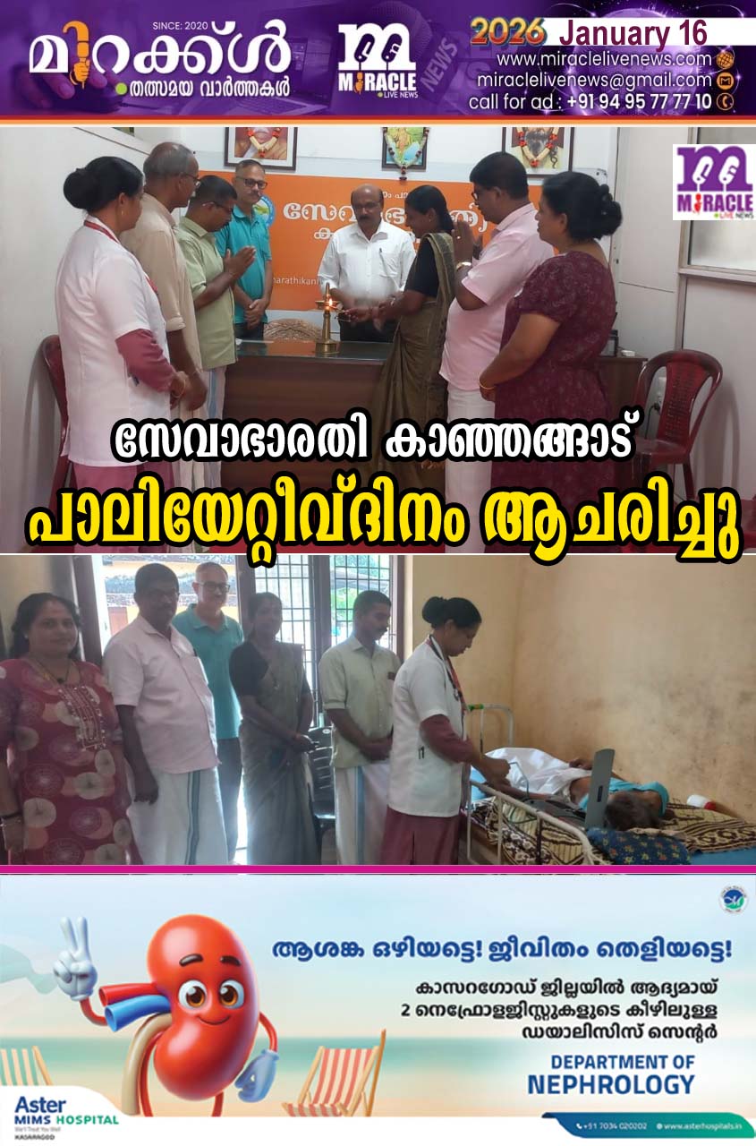 കാഞ്ഞങ്ങാട്: സേവാഭാരതി കാഞ്ഞങ്ങാട് പാലിയേറ്റീവ്ദിനം ആചരിച്ചു. സേവാഭാരതി ഓഫീസില് നടന്ന ചടങ്ങില് സേവാഭാരതി മുന് സെക്രട്ടറിയും അജാനൂര് ഗ്രാമപഞ്ചായത്ത് മെമ്പറുമായ ഗീതാബാബുരാജ് ദീപപ്രോജ്വലനം നടത്തി. സേവാഭാരതി പ്രസിഡന്റ് ഗുരുദത്ത് റാവു അദ്ധ്യക്ഷം വഹിച്ചു. സേവാഭാരതി സെക്രട്ടറി രാധാകൃഷ്ണന് ,സേവാഭാരതി ജില്ലാ വൈസ് പ്രസിഡന്റ് കെ.വി.ലഷ്മണന്,പാലിയേറ്റീവ് സിസ്റ്റര് പി. പ്രജിതഎന്നിവര് സംസാരിച്ചു