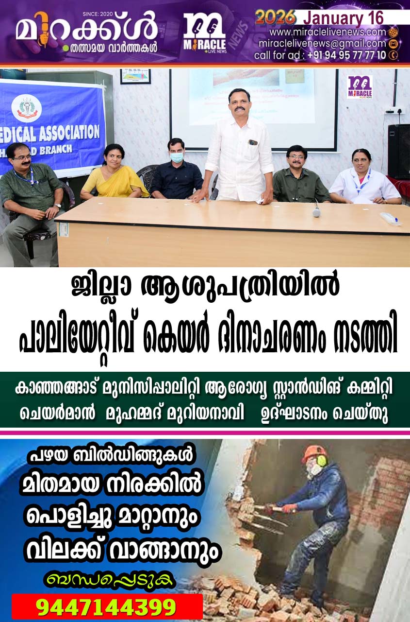 കാഞ്ഞങ്ങാട്: നഗരസഭ ജില്ലാ ആശുപത്രി കാഞ്ഞങ്ങാട്, ജില്ലാശുപത്രി ഡോക്ടര്സ് യൂണിറ്റ്, നേഴ്സസ് യൂണിറ്റ്, ഫാര്മസി യൂണിറ്റ്, ഓഫീസ് സ്റ്റാഫ്,ഐ എം എ കാഞ്ഞങ്ങാട് ബ്രാഞ്ച് എന്നിവരുടെ സംയുക്ത ആഭിമുഖ്യത്തില് ജില്ലാ ആശുപത്രിയില് പാലിയേറ്റീവ് കെയര് ദിനാചരണം നടത്തി . കാഞ്ഞങ്ങാട് മുനിസിപ്പാലിറ്റി ആരോഗ്യ സ്റ്റാന്ഡിങ് കമ്മിറ്റി ചെയര്മാന് മുഹമ്മദ് മുറിയനാവി പരിപാടി ഉദ്ഘാടനം ചെയ്തു. പാലിയേറ്റീവ് കെയര് കുടുംബാംഗങ്ങള്, ആരോഗ്യ പ്രവര്ത്തകര്, ആശാവര്ക്കര്മാര് എന്നിവര് പരിപാടിയില് പങ്കെടുത്തു . പാലിയേറ്റീവ് കുടുംബങ്ങള്ക്ക്ഭക്ഷ്യ കിറ്റും ബെഡ്ഷീറ്റും വിതരണം ചെയ്തു. കൂടാതെ ഗൃഹസന്ദര്ശനവും രോഗിപരിചരണവും നടത്തി.