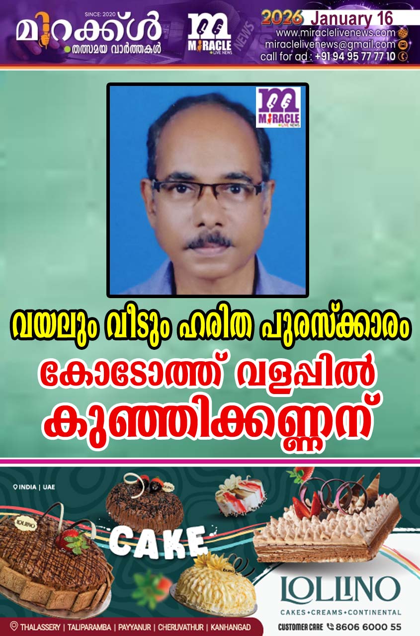 കാസര്‍കോട്: കര്‍ഷക ശാസ്ത്രജ്ഞ പരിസ്ഥിതി കൂട്ടായ്മയായ ‘വയലും വീടും ‘ ഏര്‍പ്പെടുത്തിയ വയലും വീടും ഹരിത പുരസ്‌ക്കാരം ഉദുമ കോടോത്ത് വളപ്പില്‍ കുഞ്ഞിക്കണ്ണന്. 10,000 രൂപയും ഫലകവും അടങ്ങിയതാണ് ഹരിത പുരസ്‌ക്കാരം. കാര്‍ഷിക മേഖലയിലെ സജീവതയും പരിസ്ഥിതി ബിഎംസി പ്രവര്‍ത്തനങ്ങളിലെ മാതൃകയും കണക്കിലെടുത്താണ് കുഞ്ഞിക്കണ്ണനെ അവാര്‍ഡിനു അര്‍ഹനാക്കിയത്. ജനുവരി 18ന് ഞായറാഴ്ച രാവിലെ 10.30ന് ഉദുമ, മാങ്ങാട്ട് നടക്കുന്ന വയലും വീടും ഹരിത സംഗമത്തില്‍ വച്ച് പുരസ്‌കാരം വിതരണം ചെയ്യും. കണ്ണൂര്‍കാസര്‍കോട് ക്രൈംബ്രാഞ്ച് എസ് പി പി ബാലകൃഷ്ണന്‍ നായര്‍ ഉദ്ഘാടനം ചെയ്യും. കണ്ണാറവാഴ ഗവേഷണ കേന്ദ്രം പ്രിന്‍സിപ്പല്‍ സൈന്റിസ്റ്റ് ഡോ. ഗവാസ് രാകേഷ്, മുഖ്യാതിഥിയാകും. ഉദുമ ഗ്രാമ പഞ്ചായത്ത് പ്രസിഡണ്ട് പി.വി രാജേന്ദ്രന്‍, ഡിവൈ.എസ്പി ബാബു പെരിങ്ങേത്ത് , രവീന്ദ്രന്‍ കൊടക്കാട്,പുല്ലൂര്‍ പെരിയ ഗ്രാമ പഞ്ചായത്ത് അംഗം ഉഷ എന്‍ നായര്‍, എ.കെ ജയപ്രകാശ്, ഡോ. സന്തോഷ് കുമാര്‍ കൂക്കള്‍ തുടങ്ങിയവര്‍ സംബന്ധിക്കുമെന്ന് ഭാരവാഹികളായ ഇ. ജനാര്‍ദ്ദനന്‍ പാണൂര്‍, കണ്ണാലയം നാരായണന്‍, എ. ബാലകൃഷ്ണന്‍ ആലക്കോട്, രാധാകൃഷ്ണന്‍ മാങ്ങാട്, പുരസ്‌കാര സമിതി ചെയര്‍മാന്‍ ഡോ. കെ. ചന്ദ്രന്‍ എന്നിവര്‍ വാര്‍ത്താ സമ്മേളനത്തില്‍ അറിയിച്ചു.