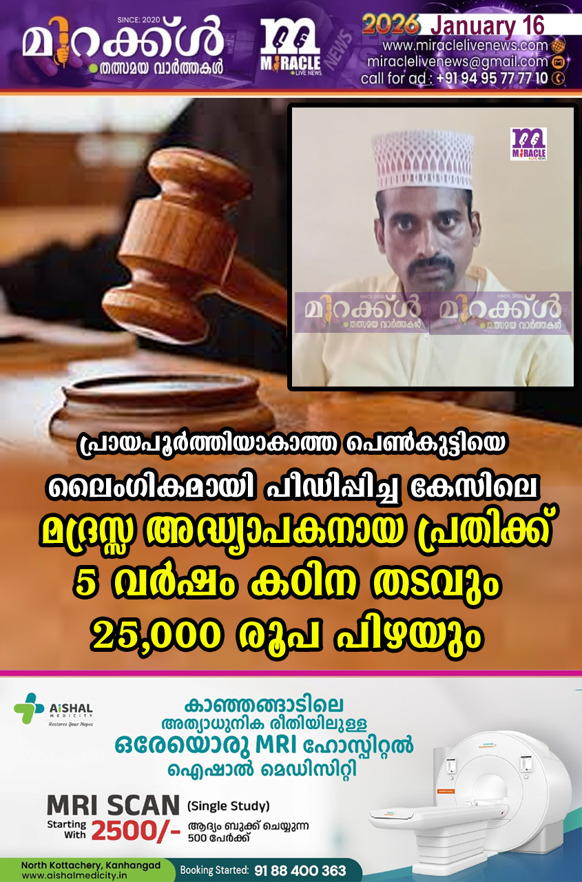 കാഞ്ഞങ്ങാട്: പ്രായപൂര്ത്തിയാകാത്ത പെണ്കുട്ടിയെ ലൈംഗികമായി പീഡിപ്പിച്ച കേസിലെ മദ്രസ്സ അദ്ധ്യാപകനായ പ്രതിക്ക് 5 വര്ഷം കഠിന തടവും 25,000 രൂപ പിഴയും, പിഴ അടച്ചില്ലെങ്കില് 6 മാസം അധിക തടവിനും ശിക്ഷ വിധിച്ചു. വെള്ളരിക്കുണ്ട് പോലീസ് സ്റ്റേഷന് പരിധിയില് താമസിക്കുന്ന 11വയസ്സ് പ്രായമുള്ള പെണ്കുട്ടിയെ മദ്രസ്സ അദ്ധ്യാപകനും പ്രതിയുമായ
