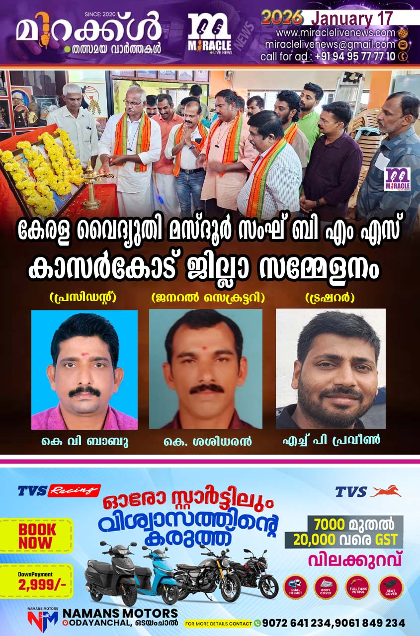 കേരള വൈദ്യുതി മസ്ദൂര് സംഘ് ബി എം എസ് കാസര്കോട് ജില്ലാ സമ്മേളനം കാസര്കോട് ബി എം എസ് കാര്യാലയത്തില് നടന്നു. കെ വി എം എസ് സംസ്ഥാന വൈസ് പ്രസിഡന്റ്കെ എന് കൃഷ്ണന് കുട്ടി സമ്മേളനം ഉദ്ഘടാനം ചെയ്തു. പ്രസിഡന്റ് കെ വി ബാബു അധ്യക്ഷനായി. കെ വി എം എസ് സംസ്ഥാന സെക്രട്ടറി ബിനീഷ് ചേറാടി മുഖ്യ പ്രഭാഷണം നടത്തി. എന് ജി ഒ സംഘ് ജില്ലാ പ്രസിഡന്റ് രഞ്ജിത്ത്, കെ വി എം എസ് ഭാരവാഹികളായ ചന്ദ്രശേഖരനായക്, എച്ച് പി പ്രവീണ് , മഹേഷ്, പ്രദീപ് ഗോപി, രാജേഷ് എന്നിവര് സംസാരിച്ചു.