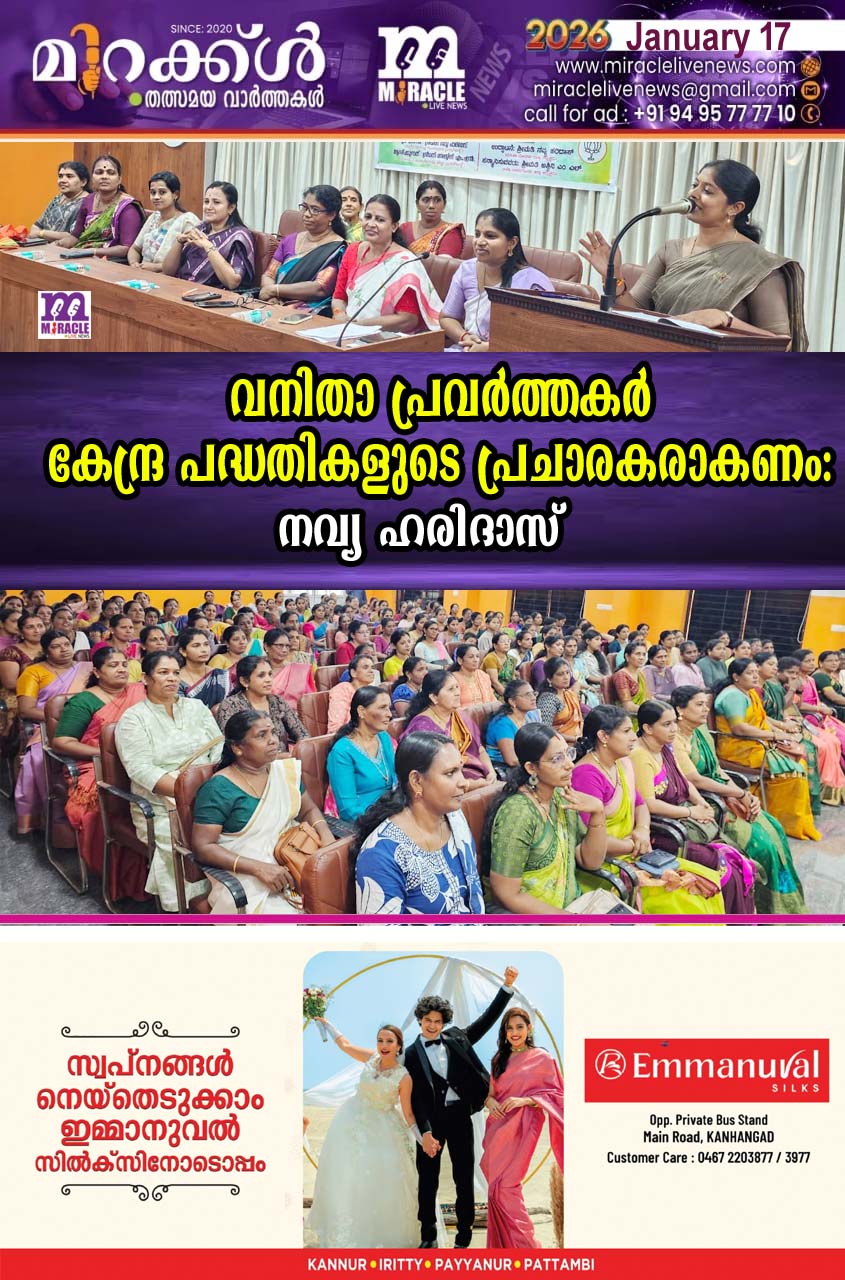 വനിതാ പ്രവര്‍ത്തകര്‍ കേന്ദ്ര പദ്ധതികളുടെ പ്രചാരകരാകണം : നവ്യ ഹരിദാസ്