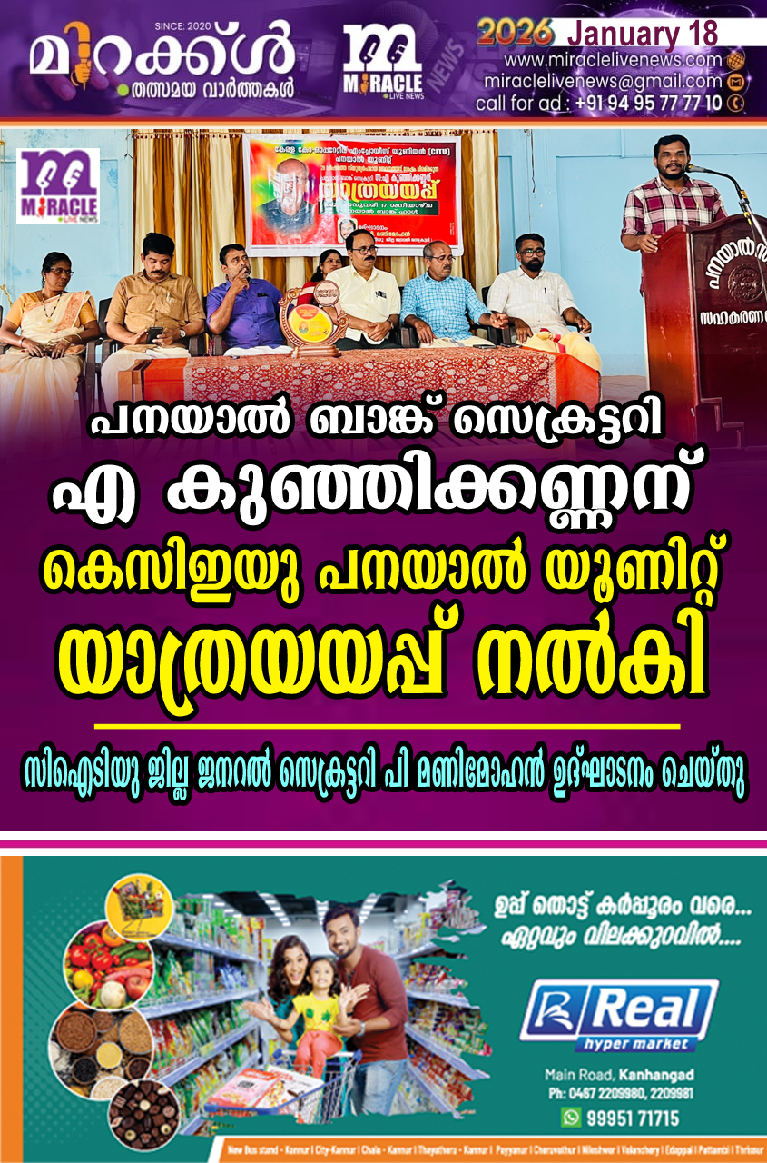 പനയാല്‍ : കേരള കോഓപ്പറേറ്റീവ് എംപ്ലോയീസ് യൂണിയന്‍ മുന്‍ ജില്ലാ കമ്മിറ്റി അംഗവും പനയാല്‍ ബാങ്ക് സെക്രട്ടറിയുമായിരുന്ന എ കുഞ്ഞിക്കണ്ണന് കെസിഇയു പനയാല്‍ യൂണിറ്റ് യാത്രയയപ്പ് നല്‍കി. പനയാല്‍ ബാങ്ക് ഹാളില്‍ വച്ച് നടന്ന പരിപാടി സിഐടിയു ജില്ല ജനറല്‍ സെക്രട്ടറി പി മണിമോഹന്‍ ഉദ്ഘാടനം ചെയ്തു. യൂണിറ്റ് പ്രസിഡന്റ് നാരായണന്‍ കുന്നൂച്ചി അധ്യക്ഷനായി. കെസിഇയു ജില്ല സെക്രട്ടറി കെ വി വിശ്വനാഥന്‍ ഉപഹാരം നല്‍കി. എ കുഞ്ഞിക്കണ്ണന്‍ മറുപടി പ്രസംഗം നടത്തി. ഉദുമ ഏരിയ പ്രസിഡന്റ് കെ ദാമോദരന്‍, ഏരിയ കമ്മിറ്റി അംഗങ്ങളായ കാഞ്ചന, ഉഷാകുമാരി എന്‍, പനയാല്‍ ബാങ്ക് സെക്രട്ടറി എ ശാന്ത, വിനോദ് പനയാല്‍ എന്നിവര്‍ സംസാരിച്ചു. യൂണിറ്റ് സെക്രട്ടറി ഹരി വില്ലാരംപതി സ്വാഗതവും എ ചന്ദ്രന്‍ നന്ദിയും പറഞ്ഞു.