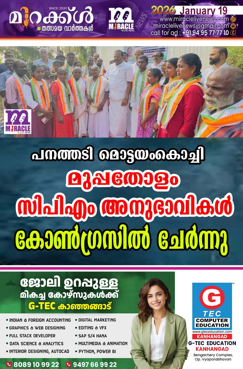 പാണത്തൂര്‍: സിപിഎം ബന്ധം ഉപേക്ഷിച്ച് മുപ്പതോളം കോണ്‍ഗ്രസില്‍ ചേര്‍ന്നു. പനത്തടി പഞ്ചായത്ത് 16ാം വാര്‍ഡ് മൊട്ടയംകൊച്ചി ഉന്നതിയിലെപത്മനാഭന്‍, തങ്കമണി, ആതിര, ആദിത്യ, അശ്വിന്‍, കുമ്പ, സരസുധന്‍, ഭീംനാഥ്, രേഷ്മ, ജ്യോതിഷ്, ബിനു, ശ്രുതി, നാരായണന്‍, ലീല, സൗമ്യ, നാരായണി, ചന്ദ്രന്‍ തുടങ്ങിയവരാണ് കോണ്‍ഗ്രസില്‍ ചേര്‍ന്നത്. എം പി രാജ്‌മോഹന്‍ ഉണ്ണിത്താന്‍ ത്രിവര്‍ണ്ണ ഷാളണിയിച്ച് കോണ്‍ഗ്രസ്സിലേക്ക് സ്വീകരിച്ചു. ഡിസിസി ജനറല്‍ സെക്രട്ടറി ഹരീഷ് പി നായര്‍, മണ്ഡലം പ്രസിഡന്റ് ജെയിംസ് കെ.ജെ, കള്ളാര്‍ മുന്‍ പഞ്ചായത്ത് പ്രസിഡന്റ് എച്ച് വിഘ്‌നേശ്വര ഭട്ട്, ബ്ലോക്ക് വൈസ് പ്രസിഡന്റ് സന്തോഷ് ടോം ജോസ്, ബ്ലോക്ക് സെക്രട്ടറി രാജീവ് തോമസ്, മണ്ഡലം വൈസ് പ്രസിഡന്റ് എം ജയകുമാര്‍, പഞ്ചായത്ത് സ്റ്റാന്‍ഡിങ് കമ്മിറ്റി ചെയര്‍പേഴ്‌സണ്‍ സുപ്രിയ അജിത്ത്, പഞ്ചായത്ത് മെമ്പര്‍മാരായ എന്‍ വിന്‍സന്റ്, കെ.രാധിക കെ, വിജി മണിയംകുളം, യൂത്ത് കോണ്‍ഗ്രസ് മണ്ഡലം പ്രസിഡന്റ് അജീഷ്, പി.എം ജമാല്‍ എന്നിവര്‍ സംബന്ധിച്ചു.
