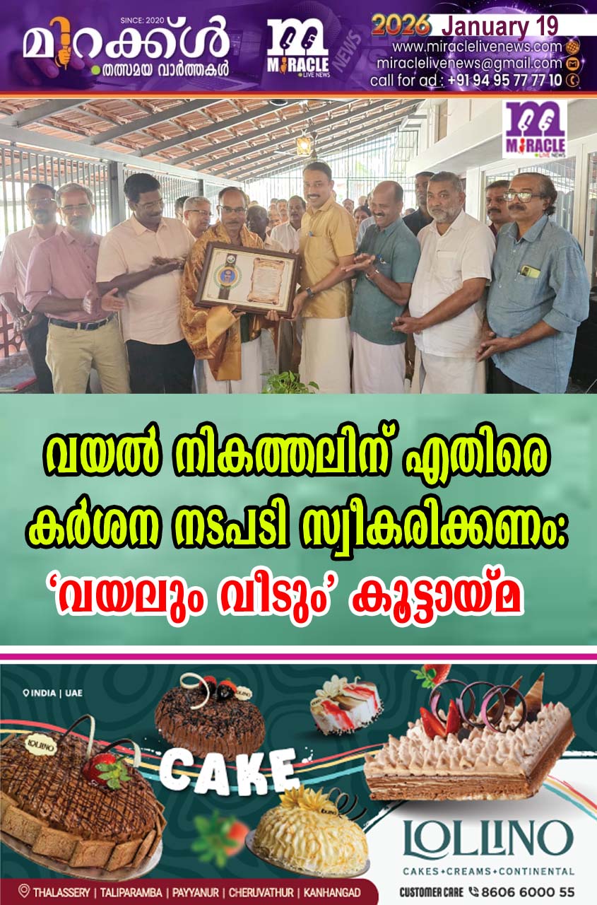 കാസര്കോട്: വയല് നികത്തലിന് എതിരെ കര്ശന നടപടി സ്വീകരിക്കണമെന്ന് കര്ഷകശാസ്ത്രജ്ഞപരിസ്ഥിതി കൂട്ടായ്മയായ ‘വയലും വീടും’ വാര്ഷിക സംഗമം ആവശ്യപ്പെട്ടു. ഇപ്പോഴത്തെ നിലയില് നികത്തല് തുടരുകയാണങ്കില് സമീപ ഭാവിയില് തന്നെ വയലും നെല്കൃഷിയും ഇല്ലാതാകുന്ന സാഹചര്യം ഉണ്ടാകുമെന്നും ഇത് കുടിവെള്ളക്ഷാമം രൂക്ഷമാക്കുമെന്നും സംഗമം അഭിപ്രായപ്പെട്ടു. ഉദുമ ,മീത്തല് മാങ്ങാട് രാധാകൃഷ്ണന് മാങ്ങാടിന്റെ വസതിയില് നടന്ന സംഗമം കണ്ണൂര് കാസര്കോട് ക്രൈംബ്രാഞ്ച് എസ്പി പി ബാലകൃഷ്ണന് നായര് ഉദ്ഘാടനം ചെയ്തു. ‘വയലും വീടും’ ഏര്പ്പെടുത്തിയ ഹരിത പുരസ്ക്കാരം ഉദുമ കോടോത്ത് വളപ്പില് കുഞ്ഞിക്കണ്ണന് എസ് പി കൈമാറി. 10,000 രൂപയും ഫലകവും അടങ്ങിയതാണ് പുരസ്ക്കാരം. കാര്ഷിക മേഖലയിലെ സജീവതയും പരിസ്ഥിതി ബിഎംസി പ്രവര്ത്തനങ്ങളിലെ മാതൃകയും കണക്കിലെടുത്താണ് കുഞ്ഞിക്കണ്ണനെ അവാര്ഡിനു തെരഞ്ഞെടുത്തത്. ബേക്കല് ഗവ. ഫിഷറീസ് ഹയര്സെക്കന്ററി സ്കൂളിന് സംസ്ഥാന ജൈവവൈവിധ്യ ബോര്ഡിന്റെ മികച്ച സ്കൂളിനുളള അവാര്ഡ് ലഭിക്കാന് നേതൃത്വം നല്കിയ അധ്യാപകന് എ കെ ജയപ്രകാശിനെ ഉദുമ ഗ്രാമ പഞ്ചായത്ത് പ്രസിഡന്റ് പി വി രാജേന്ദ്രനും പുല്ലൂര് പെരിയ പഞ്ചായത്ത് അംഗമായി തെരഞ്ഞെടുക്കപ്പെട്ട ഉഷ എന് നായരെ മുഖ്യാതിഥി യും കണ്ണാറ വാഴ ഗവേഷണ കേന്ദ്രം പ്രിന്സിപ്പല് സയിന്റിസ്റ്റുമായ ഡോ. ഗവാസ് രാകേഷും ആദരിച്ചു. പ്രസിഡന്റ് ജനാര്ദ്ദനന് പാണുര് അധ്യക്ഷത വഹിച്ചു. രവീന്ദ്രന് കൊടക്കാട് , കണ്ണാലയം നാരായണന് , ഡോ.കെ. ചന്ദ്രന് ,ഡോ. സന്തോഷ് കുമാര് കൂക്കള്, ഉഷ എന് നാരായണന്, ബാലകൃഷ്ണന് ആലക്കോട്, കെടിഎസ് പനയാല്, രാധാകൃഷ്ണന് മാങ്ങാട് സംസാരിച്ചു. ഭാരവാഹികളായി ജനാര്ദ്ദനന് പാണൂര് (പ്രസി ), രവീന്ദ്രന് കൊടക്കാട് (വൈസ് പ്രസി),കണ്ണാലയം നാരായണന് (സെക്ര) കെ.ടി.എസ് പനയാല് (ജോ.സെക്രട്ടറി) എ.ബാലകൃഷ്ണന് (ട്രഷറര്) എന്നിവരെ വീണ്ടും തെരഞ്ഞെടുത്തു.