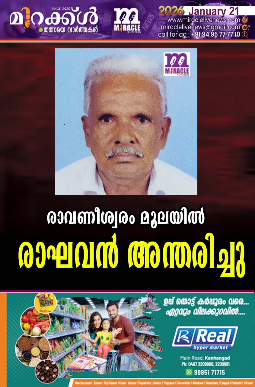 രാവണീശ്വരം:മൂലയില് രാഘവന് (73) അന്തരിച്ചു.ഭാര്യ: നളിനി.മക്കള്:എം.പുഷ്പ,എം.സിമി,പരേതനായ രതീഷ്.മരുമക്കള്: അനില് (പൂച്ചക്കാട്), ടി.വി.രഞ്ജിത്ത്.സഹോദരങ്ങള്:കല്ല്യാണി, അപ്പക്കുഞ്ഞി വെളിച്ചപ്പാന്,കുഞ്ഞികൃഷ്ണന്,പരേതരായ കുഞ്ഞിരാമന്, ജാനകി.