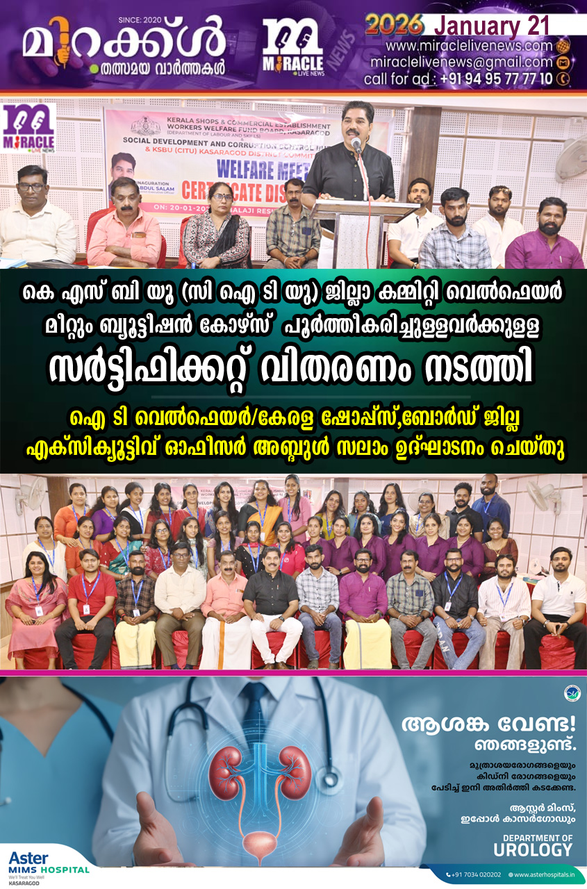 കെ എസ് ബി യൂ (സി ഐ ടി യു) ജില്ലാ കമ്മിറ്റി വെല്‍ഫെയര്‍ മീറ്റും ബ്യൂട്ടീഷന്‍ കോഴ്‌സ് പൂര്‍ത്തീകരിച്ചുള്ളവര്‍ക്കുളള സര്‍ട്ടിഫിക്കറ്റ് വിതരണം നടത്തി; ഐ ടി വെല്‍ഫെയര്‍/കേരള ഷോപ്പ്‌സ്, ബോര്‍ഡ് ജില്ല എക്‌സിക്യൂട്ടിവ് ഓഫീസര്‍ അബ്ദുള്‍ സലാം ഉദ്ഘാടനം ചെയ്തു