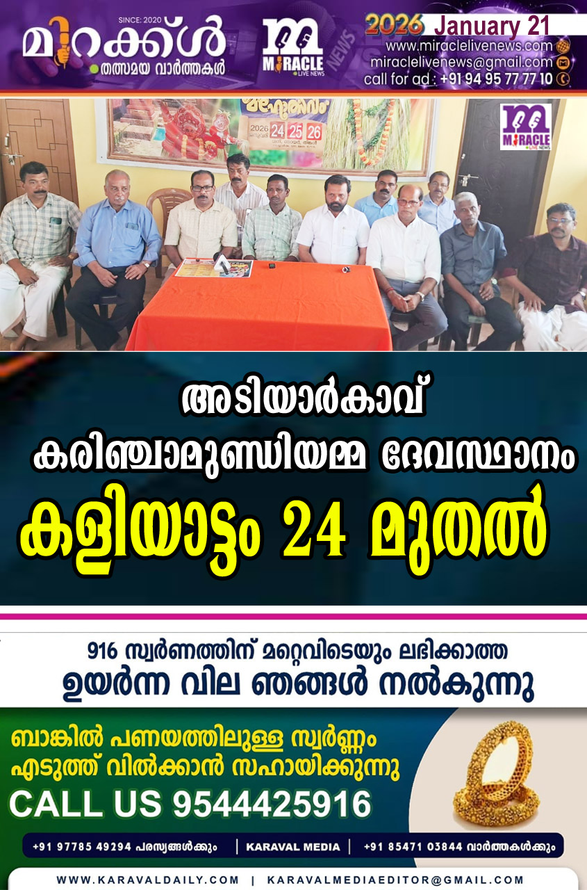 വൈകീട്ട് 6ന് ദീപാരാധനയോടെ തെയ്യം കൂടല് ചടങ്ങ്. കരിഞ്ചാമുണ്ഡിയമ്മയുടെ കൊടിയില പിടിക്കല്, തൊണ്ടച്ചന് തെയ്യം, കാപ്പാളത്തിയമ്മ, കോട്ടപ്പാറ കുഞ്ഞിക്കോരച്ചന് തെയ്യം, കുപ്പെ പഞ്ചുരുളി, അണ്ണപ്പ പഞ്ചുരുളി, പുലിച്ചാമുണ്ഡി, കല്ലൂര്ട്ടി തെയ്യങ്ങളുടെ തുടങ്ങലും മേലേരിക്ക് അഗ്നിപകരലും നടക്കും. 25 ന് പുലര്ച്ചെ രണ്ടു മണിയോടെ പുലിച്ചാമുണ്ഡി തെയ്യത്തിന്റെ അഗ്നി പ്രവേശം, 4 ന് കരിഞ്ചാമുണ്ഡിയമ്മയുടെ പുറപ്പാട്, കുറത്തിയമ്മ, പേത്താളന്,പരതാളി, തൂവക്കാളി, കാട്ടുമടന്ത, മന്ത്രഗുളികന് തെയ്യങ്ങളുടെ പ്രവേശം. വൈകിട്ട് 6ന് ദീപാരാധനയ്ക്ക് ശേഷം വിഷ്ണുമൂര്ത്തി, രക്തചാമുണ്ഡി, പന്നിക്കൂര് ചാമുണ്ഡി, പൊട്ടന് തെയ്യം കൊടിയില പിടിക്കല് ,രാത്രി 9 ന് വിഷ്ണുമൂര്ത്തിയുടെ കുളിച്ചു തോറ്റം, മന്ത്രമൂര്ത്തി തെയ്യങ്ങള്. 26 ന് പുലര്ച്ചെ രണ്ടു മണിക്ക് പൊട്ടന് തെയ്യം. രാവിലെ രക്തചാമുണ്ഡി, പന്നിക്കൂര് ചാമുണ്ഡി, വിഷ്ണുമൂര്ത്തി, ഗുളികന് എന്നീ തെയ്യങ്ങള്. വൈകീട്ട് 6ന് വിളക്കിലരിയോടെ കളിയാട്ട സമാപനം. വാര്ത്ത സമ്മേളനത്തില് കളിയാട്ട സമിതി ചെയര്മാന് ജനാര്ദ്ദനന് പുല്ലൂര് ,വര്ക്കിംഗ് ചെയര്മാന് സുകുമാരന് പെരിയച്ചൂര്, ജനറല് കണ്വീനര് രമേശന് പുതിയകണ്ടം, അടിയാര് കാവ് തറവാട്ടംഗങ്ങളായ ഭാസ്കരന് കല്യാണ് റോഡ് ,അനില് കുമാര് കല്യാണ് റോഡ്,സുനില്കുമാര് കല്യാണ് റോഡ്, മുരളി കല്യാണ് റോഡ്, രക്ഷധികാരികളായ കെ വി ചന്തു കാവുങ്കാല്, നാരായണന് കൊള്ളിക്കാട്, രാമചന്ദ്രന് പാതിരിക്കുന്ന്, അന്നദാന സമിതി ചെയര്മാന് ഭരതന് കണ്ടത്തില്, മാരാമത്ത് സമിതി ചെയര്മാന് കൃഷ്ണന് പെരളം , സാമ്പത്തിക സമിതി ചെയര്മാന് മോഹന്ദാസ് കാവുങ്കല്