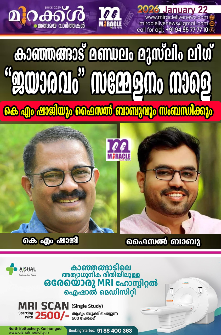 മുസ്ലിം ലീഗ് സംസ്ഥാന സെക്രെട്ടറി കെ എം ഷാജി ഉദ്ഘാടനം ചെയ്യും.യൂത്ത് ലീഗ് ദേശീയ ജനറല് സെക്രട്ടറി അഡ്വ:വി കെ ഫൈസല് ബാബു മുഖ്യപ്രഭാഷണം നടത്തും.മുസ്ലിം ലീഗ് സംസ്ഥാന സെക്രട്ടറിയേറ്റ് അംഗമായി തെരഞ്ഞെടുക്കപ്പെട്ട നിയോജക മണ്ഡലം മുസ്ലിം ലീഗ് പ്രസിഡന്റ് ബഷീര് വെള്ളിക്കോത്തിന് സമ്മേളനത്തില് സ്വീകരണം നല്കും.പാര്ട്ടിയുടെയും പോഷക ഘടകങ്ങളുടെയും ജില്ലാ മണ്ഡലം നേതാക്കള് പ്രസംഗിക്കും.കഴിഞ്ഞ കാലയളവില് 11 നഗരസഭ കൗണ്സിലര്മാരും എട്ട് ഗ്രാമ പഞ്ചായത്തംഗങ്ങളും ഉള്പ്പെടെ 19 പ്രതിനിധികള് ഉണ്ടായിരുന്ന മണ്ഡലത്തില് 13 നഗരസഭ കൗണ്സിലര്മാര് അജാനൂര്, കിനാനൂര് കരിന്തളം, കോടോം ബേളൂര്,പനത്തടി പഞ്ചായത്തുകളിലായി 9 അംഗങ്ങള്,കാഞ്ഞങ്ങാട്,പരപ്പ ബ്ലോക്ക് പഞ്ചായത്തുകളില് അജാനൂര്,ബാളാല് പഞ്ചായത്തുകളില് നിന്ന് ഓരോ അംഗം എന്നിങ്ങനെ 25 പേരെ ജയിപ്പിച്ച് ഉജ്ജ്വലമുന്നേറ്റമാണ് മുസ്ലിം ലീഗ് ഇത്തവണ കാഞ്ഞങ്ങാട് നിയോജക മണ്ഡലത്തില് കാഴ്ച വെച്ചത്.