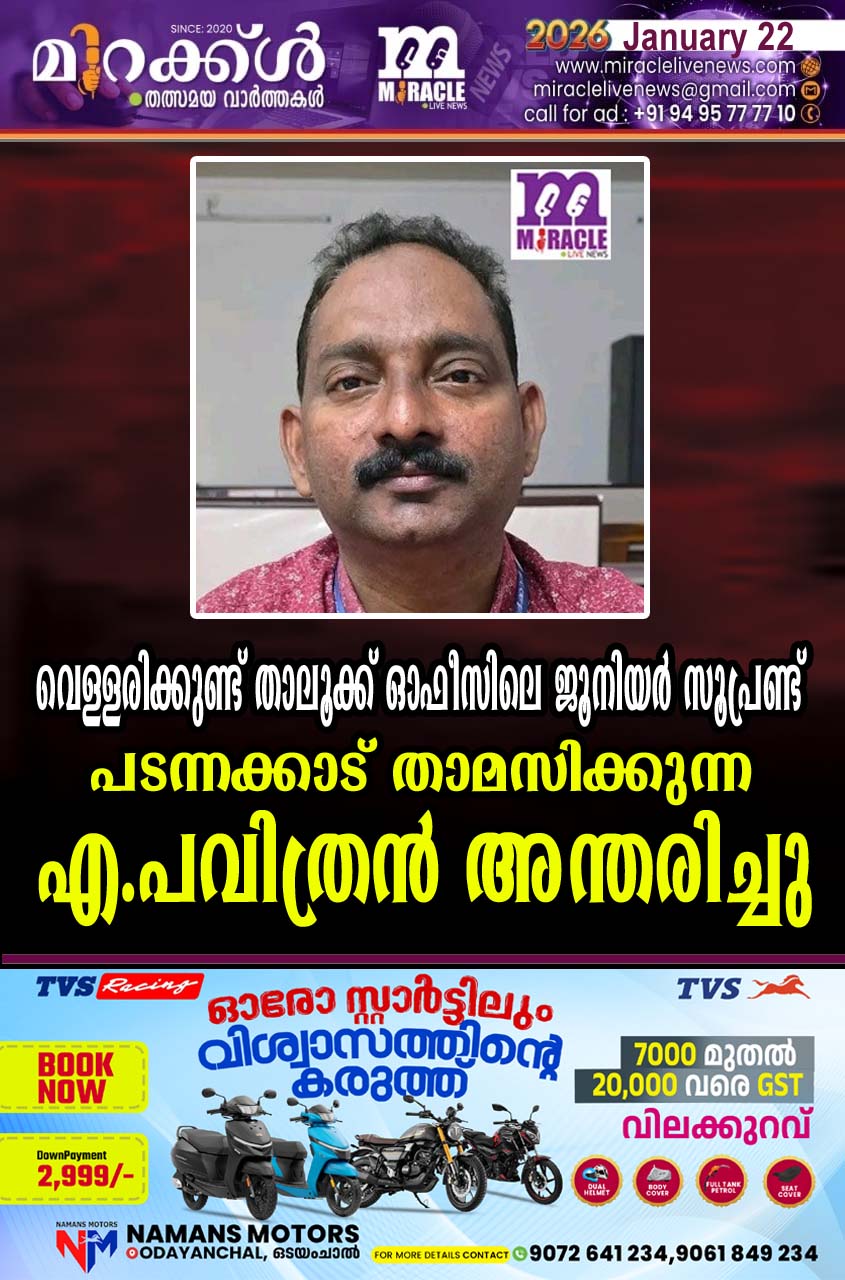 കാഞ്ഞങ്ങാട്: വെള്ളരിക്കുണ്ട് താലൂക്ക് ഓഫീസിലെ ജൂനിയര് സൂപ്രണ്ട് പടന്നക്കാട് താമസിക്കുന്ന എ.പവിത്രന്(53) അന്തരിച്ചു. അസുഖത്തെ തുടര്ന്ന് പരിയാരം മെഡിക്കല് കോളേജ് ആശുപത്രി ചികിത്സയ്ക്കിടെ ഇന്ന് പുലര്ച്ചയാണ് മരണം. വിവാദ ഫേസ്ബുക്ക് പോസ്റ്റിനെ തുടര്ന്ന് കഴിഞ്ഞ വര്ഷം ജനുവരി 12 മുതല് സസ്പെന്ഷനിലായിരുന്നു. സസ്പെന്ഷന് പിരീഡ് കഴിഞ്ഞുവെങ്കിലും അസുഖത്തെത്തുടര്ന്ന് തിരികെ ജോലിയില് ഹാജര് ആയിരുന്നില്ല. ഭാര്യ: ധന്യ. മക്കള്: നന്ദകിഷന്, ഋഷിക.സഹോദരങ്ങള്: എ.ശശികുമാരന്, ബാലചന്ദ്രന്, മോഹനന്,പദ്മിനി, ഉദയഭാനു.
