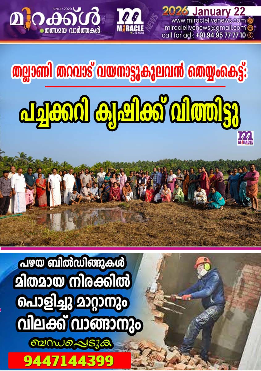 പാലക്കുന്ന്: ചിറമ്മല് മലാംകുന്ന് തല്ലാണി തറവാട്ടില് നടക്കുന്ന വയനാട്ടുകുലുവന് തെയ്യം കെട്ടുത്സവത്തിന് സദ്യയൊരുക്കാന് പച്ചക്കറി കൃഷിക്ക് വിത്തിട്ടു. സദ്യ യൊരുക്കാന് വിഷരഹിത പച്ചക്കറി വേണമെന്ന ആഘോഷകമ്മിറ്റിയുടെ മുന് തീരുമാനത്തെ തുടര്ന്ന് തറവാടിന് സമീ പത്ത് പ്രാദേശിക സമിതി കണ്ടെത്തിയ അര ഏക്കറിലേറെയുള്ള വയലില് വിവിധ ഇനം പച്ചക്കറികള് വിളയിച്ചെടുക്കും. കൃഷി ഓഫീസര് ടി.വി. വിനീത് വിത്തിടല് ഉദ്ഘാടനം ചെയ്തു. ആഘോഷ കമ്മിറ്റി ചെയര്മാന് സി.എച്ച്. നാരായണന് അധ്യക്ഷനായി. വാര്ഡ് അംഗം ജയ സന്ധ്യ, ജനറല് കണ്വീനര് പി.ബി. കുഞ്ഞിരാമന് പള്ളിക്കര, നാരായണന് കടപ്പുറം, അശോകന് പൊയിനാച്ചി, അപ്പകുഞ്ഞി കീക്കാനം, പി.വി.രവീന്ദ്രന്, എ.കെ.സുധീപ്, ലതാഗംഗന്, ആശാ കണ്ണന് തുടങ്ങിയവര് പ്രസംഗിച്ചു.