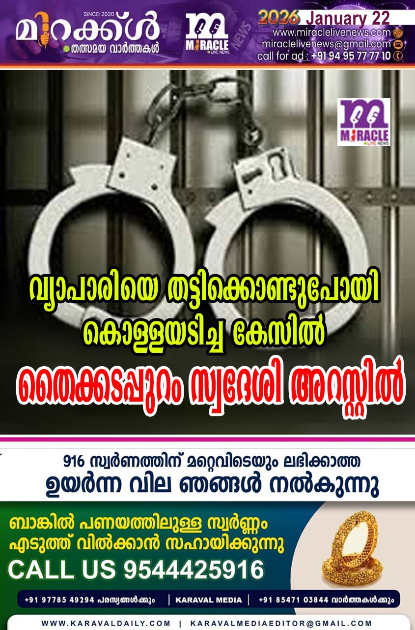 നീലേശ്വരം: വ്യാപാരിയെ തട്ടിക്കൊണ്ടുപോയി കൊള്ളയടിച്ച കേസില് ഒളിവില് കഴിയുകയായിരുന്ന തൈക്കടപ്പുറം സ്വദേശി ഷാരോണിനെ(30) നീലേശ്വരം എസ്ഐ ജി.ജിഷ്ണുവും സംഘവും അറസ്റ്റുചെയ്തു.