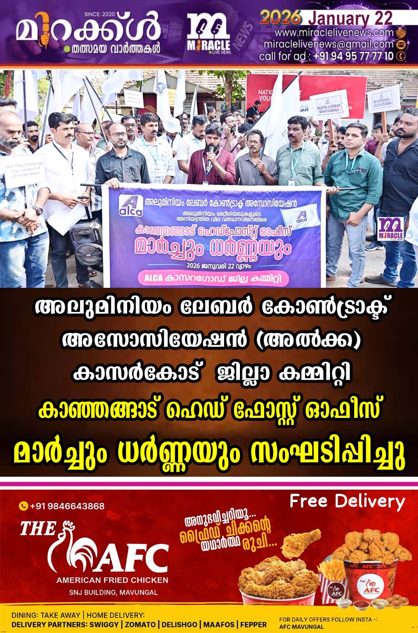 കാഞ്ഞങ്ങാട്: അനിയന്ത്രിതമായി അലൂമിനിയം വിലവര്ദ്ധനവിനെതിരെ അലുമിനിയം ലേബര് കോണ്ട്രാക്ട് അസോസിയേഷന് (അല്ക്ക) കാസര്കോട് ജില്ലാ കമ്മിറ്റിയുടെ നേതൃത്വത്തില് കാഞ്ഞങ്ങാട് ഹെഡ് ഫോസ്റ്റ് ഓഫീസ് മാര്ച്ചും ധര്ണ്ണയും സംഘടിപ്പിച്ചു. ധര്ണ്ണാസമരം അല്ക്ക സംസ്ഥാന സെക്രട്ടറി അനില്കുമാര് കണ്ണൂര് ഉദ്ഘാടനം ചെയ്തു. അല്ക്ക ജില്ലാ പ്രസിഡന്റ് സുരേന്ദ്രന് പാണം തോട് ആദ്ധ്യക്ഷത വഹിച്ചു. ജില്ലാ ട്രഷറര് രതീഷ് പള്ളിക്കര,വിനോദ് കീച്ചേരി, ശ്രീജിത്ത് എരുമക്കുളം, സോണി ജോണ് , രഞ്ജിത്ത് വെങ്ങാട്,സുജിത്ത് അമ്പങ്ങാട്ട്,വിജീത് കെ.വി പുങ്ങംചാല്, എം.എം. പ്രേംകുമാര് എന്നിവര് സംസാരിച്ചു. ജില്ലാ സെക്രട്ടറി മുഹമ്മദ് ഹാരിസ് ചെറുവത്തൂര് സ്വാഗതവുംമനോജ് കരുവളം നന്ദി പറഞ്ഞു.കാഞ്ഞങ്ങാട് പഴയ ബസ്റ്റാന്റ് പരിസരത്ത് നിന്ന് ആരംഭിച്ച പ്രകടനത്തില് ജില്ലയുടെ വിവിധ മേഖലയില് നിന്നായി നിരവധി പ്രവര്ത്തകര് പങ്കെടുത്തു.